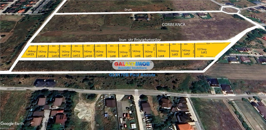 In Corbeanca pe str Ciocarliei cu Privighetorilor se vand 15 Loturi de casa majoritatea in suprafata de 524 mp ,fiecare lot are acces de 20 m la un drum de servitute de 9 m latime,unde fiecarui lot din drumul de servitute are un procent de cumparare (tabelul este mai Jos).Pe aceste loturi se pot construi case cu P 1 M : POT 30% si CUT 1%. Lotul 1= de 1173 mp 184 mp cota drum= 1357 mp = 85 e/mp Lot 2-4 = 542 mp 85 mp cota drum = 627 mp= 85 e/mp Lot 5-7 = 542 mp 85 mp cota drum = 627 mp = 80 e/mp Lot 8-14 = 542 mp 85 mp cota drum = 627 mp = 75 e/mp Lot 15 = 664 mp 101 mp cota drum = 765 mp = 75 e/mp Tel 0722273199 Informatii eficienta energetica: