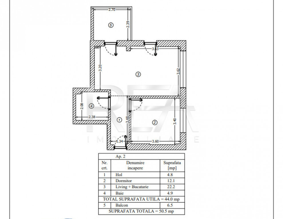 • Suprafață totală 50,5 mp: suprafață utilă 44 mp. balcon 6,5 mp.