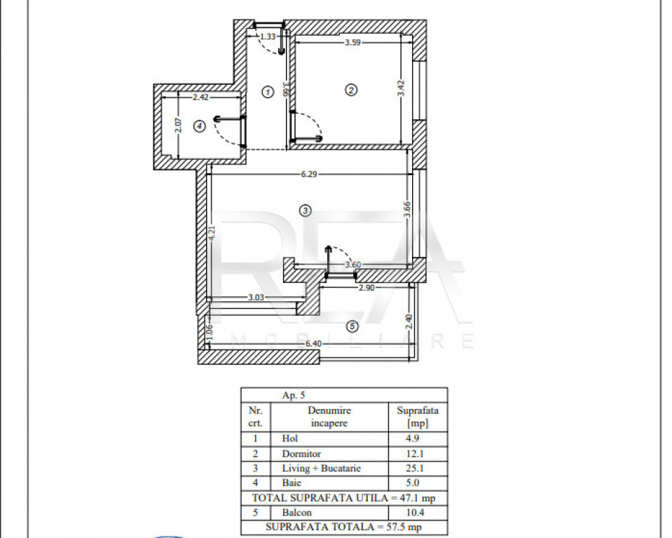 • Suprafață totală 57,6mp: suprafață utilă 47,1 mp, balcon 10,5mp.