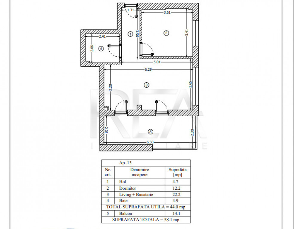 • Suprafață totală 58,1 mp: suprafață utilă 44 mp, balcon 14,1 mp.