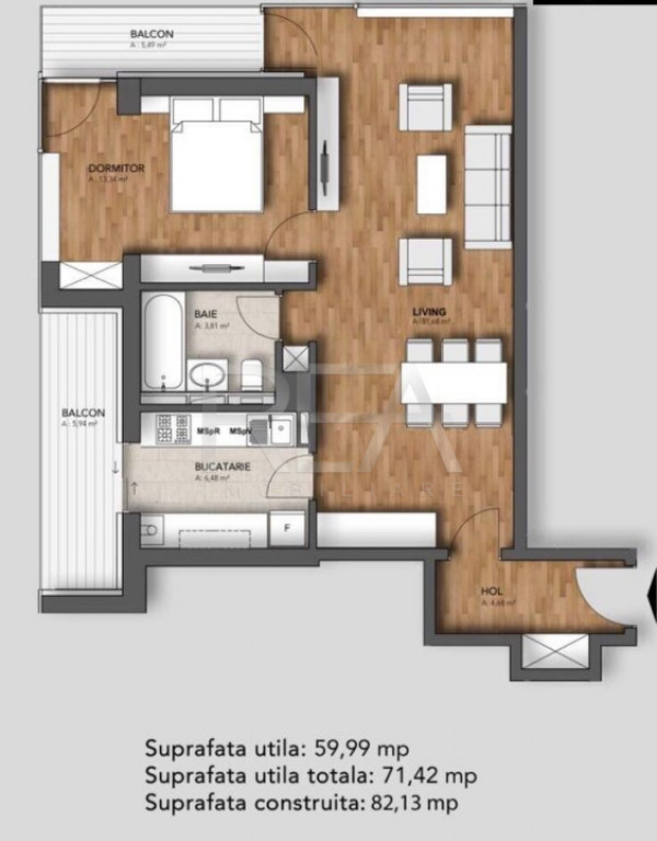 Locuința are o suprafață totală de 71,42 mp și este compartimentată eficient: un living generos de 31,68 mp, un dormitor de 13,34 mp, o bucătărie separată de 6,48 mp, o baie de 3,81 mp cu finisaje de calitate, un hol de 4,48 mp și două balcoane, cu suprafețe de 5,49 mp și 5,94 mp, ideale pentru relaxare sau spații de depozitare.
