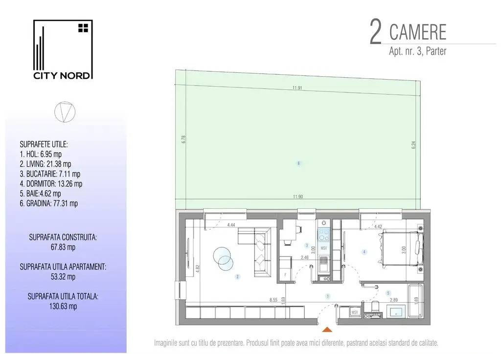 Trăiește experiența unui apartament modern cu grădină generoasă, parte din noul proiect Boutique CITY NORD de pe strada Mihai Eminescu 51. Locuința de 2 camere oferă un living spațios, bucătărie separată și un dormitor confortabil, completate de o grădină privată de 77 mp – perfectă pentru relaxare, family time sau working-from-home în aer liber. Clădirea dispune de lift, materiale premium și clasificare energetică A. Acces rapid la transport public și la toate facilitățile din Tunari. Finalizare: 2026. Suprafață construită apartament: 67.8 mp Suprafață utilă: 53.3 mp Suprafață totală: 130.6 mp Living: 21.4 mp Bucătărie: 7.1 mp Dormitor: 13.26 mp Baie: 4.6 mp Hol: 7 mp Grădină: 77.3 mp Preț loc parcare fara TVA: 3000 EURO Pozele sunt cu titlu de prezentare. Clădirea are parter, două etaje intermediare cu câte opt apartamente și un ultim nivel cu patru unități. Materialele sunt de calitate ridicată. Imobilul include lift. Termenul estimat de finalizare este 2026. Proiectul este amplasat pe una dintre arterele principale din Tunari, cu acces rapid la transportul public. Conectarea la toate utilitățile este asigurată, iar clădirea este proiectată pentru clasa energetică A. VAUNT ID: 106042