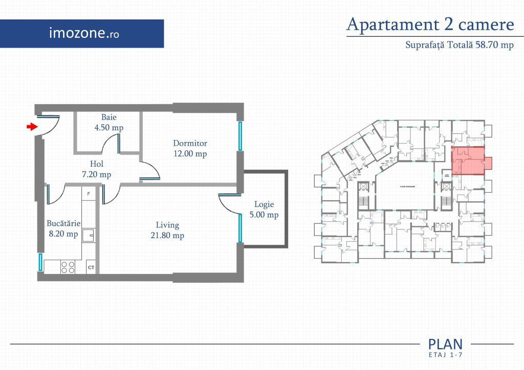 Va prezint un apartament cu doua camere, decomandat, bine compartimentat, cu suprafata de 58.7 mp, balcon de 5 mp, bucatarie inchisa cu suprafata de 8.2 mp, situat la etajul 8, intr-un bloc cu 10 etaje. Apartamentul se preda finisat la cheie, cu baie complet dotata, cu obiecte sanitare montate si bransat la toate utilitatile. Finisajele sunt de buna calitate, executate cu atentie la detalii iar in unele situatii chiar vi le puteti alege, in anumite conditii. Termen de finalizare : Proiect finalizat. Apartamente finisate pregatite pentru a te muta rapid. Zona in care se afla imobilul este una foarte usor accesibila, cu acces rapid catre mijloace de transport in comun (metrou, autobuz, troleibuz, tramvai) dar si catre principalele artere sau bulevarde. Tot in zona, la numai cateva minute, sunt numeroase facilitati precum; scoli, gradinite, centre medicale, centre comerciale, parcuri etc.. Proiectul contine peste 20 de variante de apartamente cu doua sau trei camere, cu diferite suprafete, compartimentari dar si orientari. In urma unei vizite la proiect va voi prezenta toate disponibilitatile si impreuna putem identifica proprietatea potrivita. Suna acum si programeaza o vizionare - s-ar putea sa fie exact apartamentul cel cauti! IMOZONE 0742 400 300