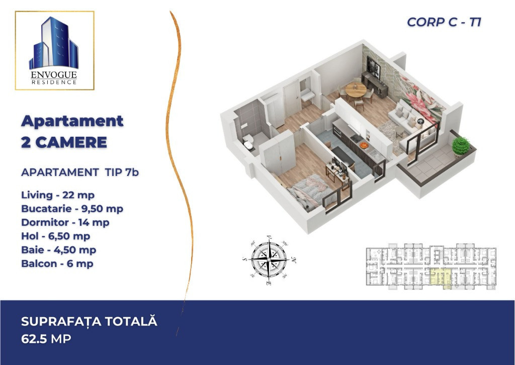 Fie că ești în căutarea unei locuințe pentru uzul propriu, fie că vrei să faci o investiție inteligentă, un apartament cu două camere rămâne una dintre cele mai viabile opțiuni pe care le ai la dispoziție. În ansamblul rezidențial EnVogue Residence - Iuliu Maniu, din vestul Capitalei, îți punem la dispoziție unități locative bicamerale cu suprafețe generoase, semnificativ peste media practicată în mod obișnuit pe această piață. Spre exemplu, apartamentul pe care ți-l propunem spre vânzare, Tipul 9D, are o suprafață utilă de 64,5 metri pătrați. Programând o vizionare, vei descoperi că locuința despre care îți vorbim se distinge prin caracteristicile devenite deja obișnuință pentru clienții EnVogue Residence, anume calitatea și siguranța construcției, alături de finisajele din categoria premium. La suprafața generoasă a acestui tip de apartament se adaugă un alt avantaj important pentru potențialii cumpărători, anume compartimentarea sa inteligentă, respectiv faptul că este o unitate locativă decomandată – ceea ce credem că va contribui mult la sporirea confortului tău! PLUS-VALOARE: Ne străduim în permanență să punem la dispoziția clienților noștri cele mai bune oferte financiare, astfel că făcând o achiziție EnVogue Residence - Iuliu Maniu te vei bucura de următoarele beneficii: • Asistență GRATUITĂ, din partea unui broker de credite profesionist, pentru cei interesați de accesarea unei finanțări bancare. • Reducere de 10% la mobila din magazinul Mobexpert Militari, la cumpărarea oricărei locuințe în cadrul EnVogue Residence - Iuliu Maniu. Aflat în dezvoltare pe Bulevardul Iuliu Maniu, nr. 586-590, în imediata apropiere a stației de metrou Preciziei, EnVogue Residence - Iuliu Maniu aduce pe piață apartamente noi de calitate superioară, cu suprafețe și compartimentări variate – garsoniere, studiouri, apartamente cu două și trei camere, dar și penthouse-uri mai spațioase. Recent finalizată, prima fază de dezvoltare a proiectului (corpul C) cuprinde 169 de unități locative, în vreme ce faza a doua (corpul B) este aflată în derulare și cuprinde 214 apartamente. Locuințele din cadrul proiectului au suprafețe generoase, peste media practicată în mod obișnuit pe acest segment de piață, în vreme ce dotările și finisajele se încadrează în categoria premium, tocmai pentru a furniza rezidenților acel plus de confort pe care și-l doresc în propriile case. Dovadă a atenției deosebite acordate siguranței și confortului locatarilor, fiecare bloc din cadrul ansamblului EnVogue Residence - Iuliu Maniu include propriul adăpost de protecție civilă, amplasat la subsolul clădirii. De asemenea, dezvoltatorul a început deja instalarea de panouri fotovoltaice în cadrul proiectului, astfel că viitorii rezidenți se vor putea bucura de confortul și beneficiile unei surse de energie regenerabilă. Specificații și facilități: • Regim de înălțime de 10 etaje • Fundație de tip radier general, cu 2 subsoluri • Structură pe cadre de beton • Adăpost de protecție civilă pentru fiecare bloc • Panouri fotovoltaice • Certificat de performanță energetică de clasa A • Compartimentări interioare din cărămidă Porotherm • Izolație exterioară realizată din vată bazaltică și polistiren • Grad ridicat de protecție ignifugă • Sistem de termoizolație și hidroizolație de la Sika pentru terase • Spații verzi și zonă de promenadă • Locuri de joacă pentru copii • Spații comerciale, restaurant, sală de fitness, supermarket • Stații de încărcare pentru mașini electrice etc. Despre EnVogue Residence Cu o experiență de circa 9 ani pe piața rezidențială din Capitală și împrejurimi, portofoliul dezvoltatorului autohton EnVogue Residence cuprinde 5 proiecte finalizate și unul aflat în curs de construcție, anume EnVogue Residence - Iuliu Maniu. Printre obiectivele avute în vedere de companie se numără, în primul rând, siguranța și confortul locatarilor, alături de accesul facil la mijloacele de transport în comun, inclusiv metrou, respectiv către principalele puncte de interes ale orașului. HAI LA VIZIONARE!!!!