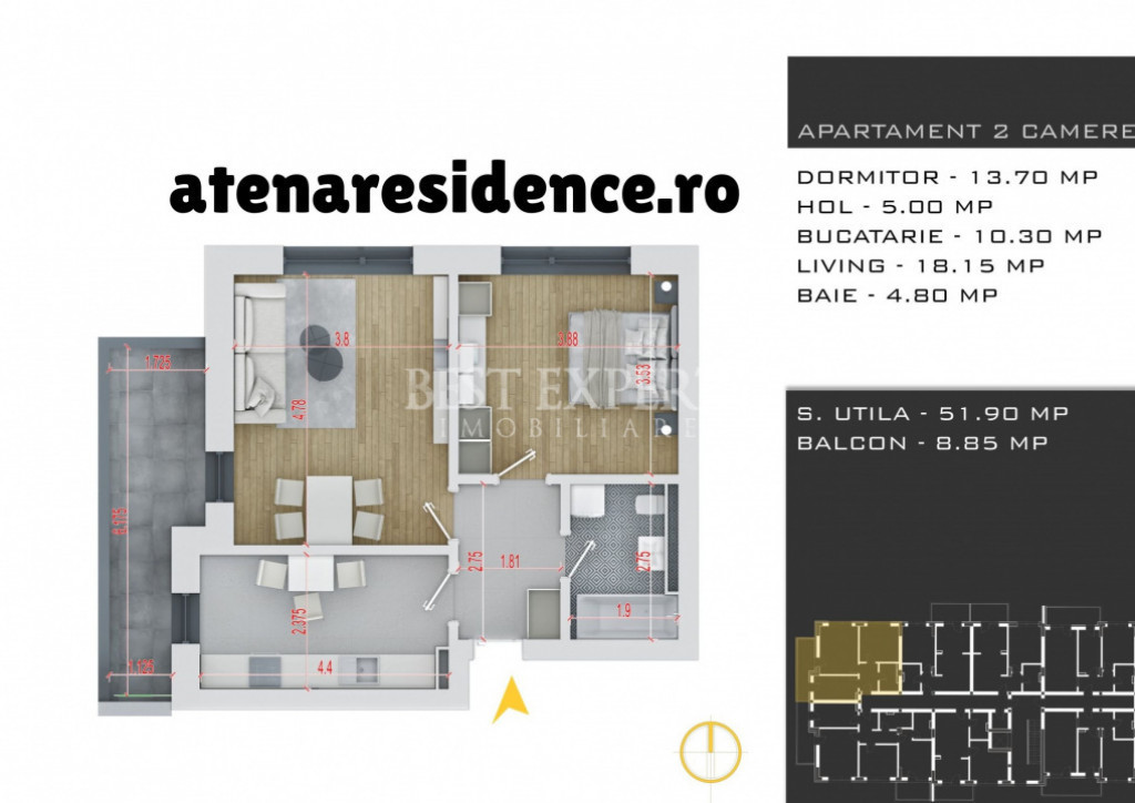 Suprafata utila - 51.91mp utili +8.85 mp balcon, total 60.76 mp utili