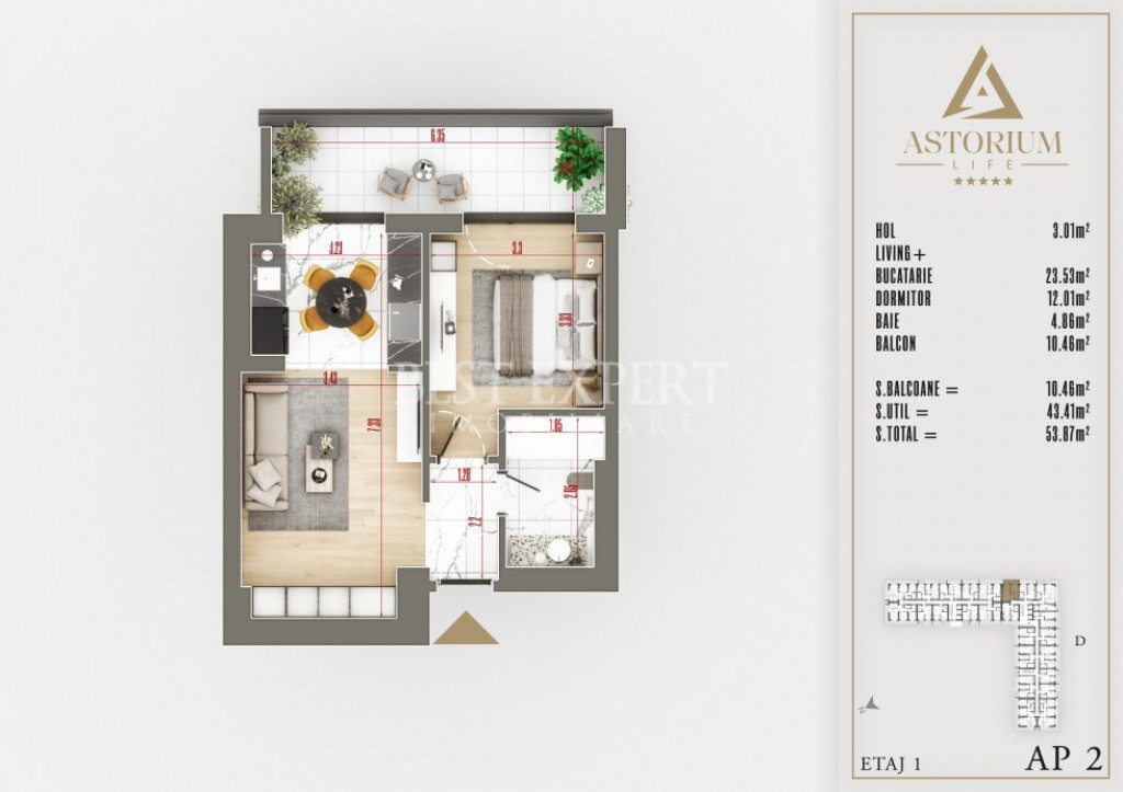 Oferta noastra completa o gasiti pe site-ul bestexpertimob.ro Birou vanzari dezvoltator Titan-Pallady Comision 0% Pret proprietate: -91.580 Euro+TVA Pozitionare : zona Theodor Pallady Tip proprietate - Apartament 2 camere Tip imobil - Parter+11 etaje Termen Finalizare - Decembrie 2025 Suprafata utila – 43.41 mp utili +10.46mp balcon, total 53.87 mp utili Utilitati publice - curent, apa, canalizare, gaz Distanta mijloace de transport in comun: -3 minute STB 253 si 330 Dotari -centrala proprie -incalzire in pardoseala -geam tripan -finisaje la alegere -piscina https://bestexpert.immoflux.ro/properties/4416/description#mainform -pista de alergare -Infrastructură smart home -vas WC incastrat ( gheberit) -izolatie tavan si pereti Id intern: P4987