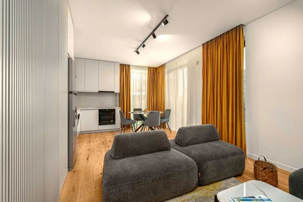 upsidetown.ro Va prezentam spre inchiriere un apartament de 2 camere cu o gradina generoasa, arhitectura moderna, cu finisaje high-end. Imobilul este pozitionat in complexul rezidential premiat international Amber Forest, cu acces direct la Pădurea Băneasa. Ansamblul rezidential este cu circuit inchis, accesul fiind 100% securizat si este situat in zona Pipera – Tunari, o zona care ofera cele mai bune cai de acces catre centrul orașului, datorita celor 4 drumuri din apropiere, dar și a autostrazilor finalizate recent (DN1, A3, Pipera- Tunari, soseaua de centura). Apartamentul este la prima inchiriere, mobilat/utilat complet, are o suprafata utila de 54 mp cu acces direct la o gradina generoasa de 88 mp unde va puteti petrece timpul cu cei dragi. Imobilul vine cu un loc de parcare suprateran inclus in pretul de inchiriere. Locuintele Amber Forest sunt primele locuinte din România care respecta standardul energetic NZEB, impus de Uniunea Europeana incepand cu 2021, astfel costurile de intretinere vor fi foarte reduse. Printre beneficiile apartamentului amintim: -pompa de caldura -sistem de încălzire prin pardoseala -camere cu tavan inalt de peste 2.75 m, conturand un spatiu generos, aerisit -tamplarie de aluminiu, cu UW 0,85 w/m2k cu geam triplu stratificat UG=0,6w/m²k -gradina cu gazon cu sistem de irigație etc Daca doriti sa locuiti langa natura intr-un mediu curat, cu aer proaspat, intr-o comunitate care impartaseste valori similare, cu oameni preocupați de calitatea vietii, de confortul casei lor personale, care doresc sa isi creasca copiii în mijlocul naturii, într-o suburbie atent planificata va astept la vizionare.