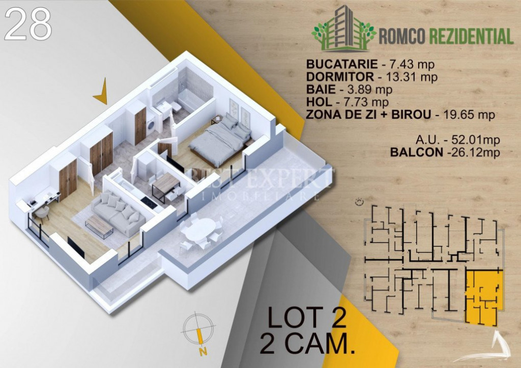 Oferta noastra completa o gasiti pe site-ul Best Expert Imobiliare Birou vanzari dezvoltator Titan-Pallady Comision 0% Sediu: Drumul Gura Crivatului, nr. 4-22, Sector 3 Waze: Best Expert Imobiliare Telefon Programari: 0741.531.808 Program vizionari: L-V 10:00-18:00 / S: 10:00-14:00 Facebook: Best Expert Imobiliare Pozitionare : zona Theodor Pallady Tip proprietate - Apartament 2 camere Tip imobil - parter+3 etaje Total unitati ansamblu - 56 unitati Termen Finalizare - Decembrie 2025 Suprafata utila -52.01 mp utili +26.12 mp balcon, total 78.13 mp utili Utilitati publice - curent, apa, canalizare, gaz Distanta mijloace de transport in comun: -3 minute - STB 253 si 330 Dotari -centrala -incalzire in pardoseala -finisaje la alegere - sistem de aspirare centralizat - sistem de ventilare cu recuperare de caldura -pompe de caldura - panouri fotovoltaice - tâmplarie PVC premium - aer conditionat - izolatie fonica ridicata -izolatie termica ridicata Id intern: P5008