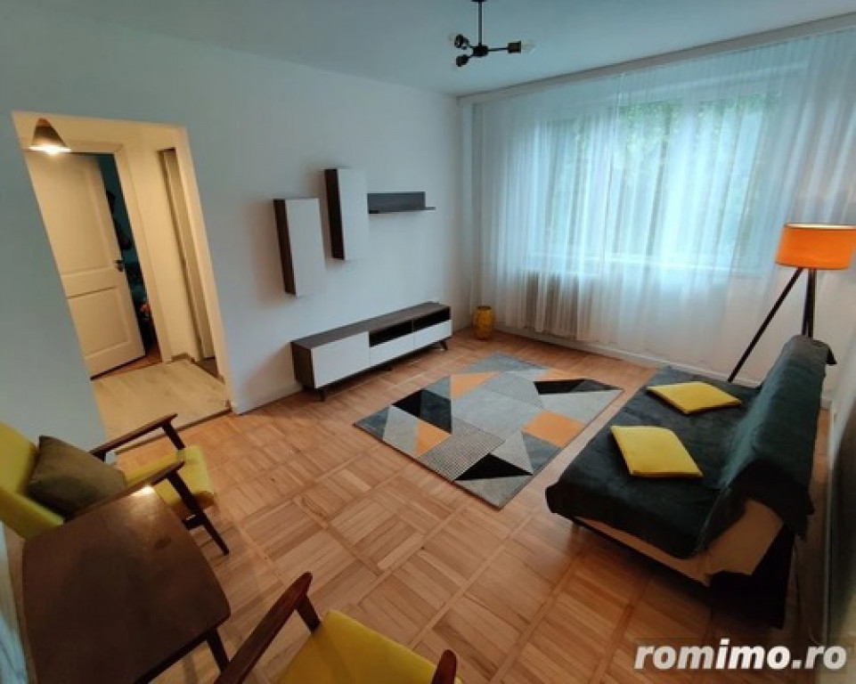 De inchiriat 2 camere semidecomandat complet mobilat si utilat :masina de spalat rufe , frigider , aragaz , geamuri termopan , gresie ,faianta , parchet laminat. Situat in zona Soarelui , statie de autobuz la 300 m. Suprafata 55 mp , etaj 2.