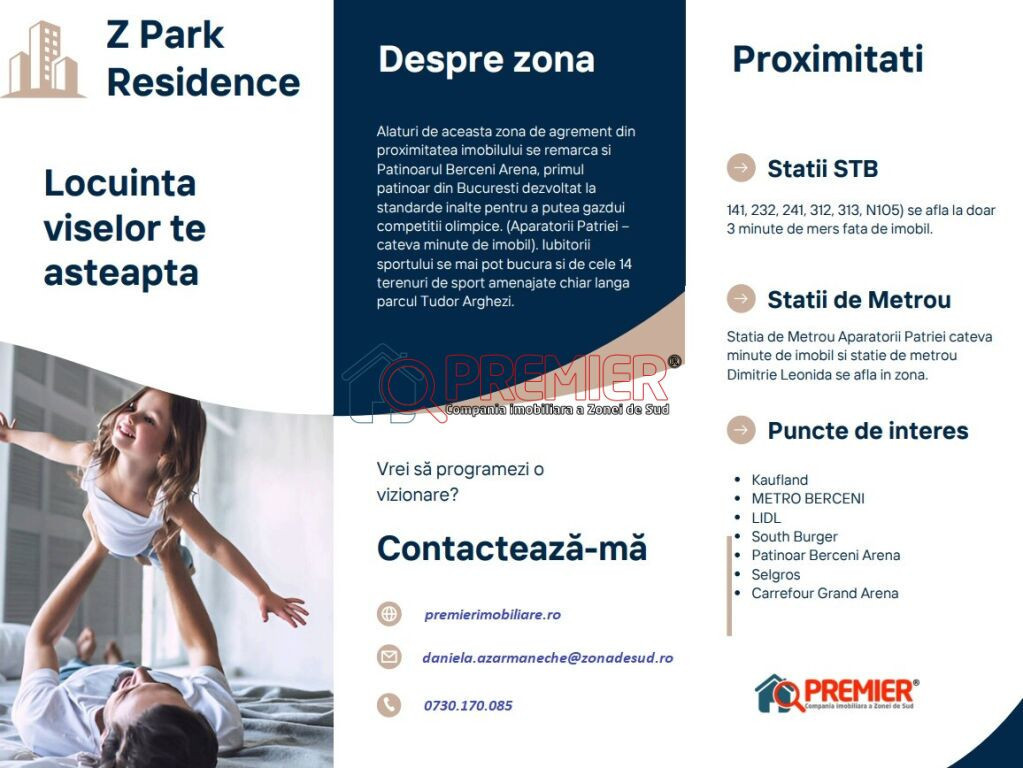 SUPER OFERTA! 2 camere - Metalurgiei - Z PARK - PRET 87.500 Euro +TVA 21% - Avans 50% - PRET 95.000 Euro +TVA 21% - Avans 15% Vanzare apartament cu 2 camere - 57,57 mp ce include si un balcon de 5 mp - in ansamblul Z PARK - Metalurgiei Apartamentul este bine compartimentat si luminos. Pozitionare excelenta - Sector 4 - Bulevardul Metalurgei - la doar 150 m de stația STB - 6 linii STB - 15-17 minute de mers pe jos la Metrou Aparatorii Patriei - Vis-a-vis de Mega Image și Profi, peste drum de LIDL Blocul dispune de 2 lifturi. Predare la cheie cu toate bransamentele, finisajele si acte la zi. Loc parcare in cladire. Comision 0% Poze cu titlu de prezentare. Pentru vizionare și detalii : Daniela Azarmaneche / 0730.170.085 Serviciul nou oferit de PREMIER Imobiliare! Solicita acum VIZIONARE ONLINE pentru aceasta proprietate! COMISION 0% Această proprietate se poate achiziționa prin orice tip de credit bancar. Departamentul nostru financiar Premier Credit Hub vă stă la dispoziție GRATUIT (comision 0%) pentru: - identificarea celei mai bune soluții de finanțare; - întocmirea dosarului bancar complet; - obținerea rapidă a creditului necesar achiziției. Beneficiați de un serviciu ALL IN ONE, cu acces direct la ofertele tuturor băncilor comerciale din România. Se acceptă inclusiv venituri din străinătate, astfel încât fiecare client să poată cumpăra în cele mai avantajoase condiții. Solicitați acum o simulare de credit direct din anunț sau cereți detalii consultantului Premier Imobiliare!