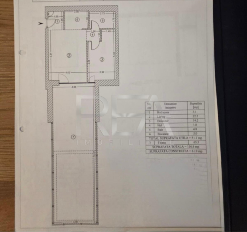 REA Imobiliare va ofera spre vanzare un apartament cu doua camere, situat in Complexul One Cotroceni. Imobilul se afla intr-un bloc de apartamente, construit in anul 2024, la etajul 2/11 si detine o suprafata totala de 116,6 m.p, din care suprafata utila este 51,1 m.p, si o terasă de 65,5 m.p. Locuinta este alcatuita din un dormitor, un living cu o bucatarie open-space, o baie, un hol si o terasă Apartamentul se vinde complet mobilat si utilat. Locul de parcare se află la -3 si este inclus în preț. Confortul termic este realizat prin pardoseala cu ajutorul centralei de imobil. In imediata apropiere se intalnesc puncte farmaceutice, medicale, comerciale, educationale, de divertisment, bancare, parcuri, piete etc. Accesul la mijloacele de transport in comun facil: 6 minute pana la statia de metrou Orizont/Academia Militara sau 3 minute pana la statia Stb Drumul Sarii sau 5 minute pana la statia de tramvai Piata Danny Huwe. Se accepta toate modalitatile de plata. Informatiile tehnice au caracter orientativ, acestea fiind preluate de la proprietari. Pentru mai multe detalii si vizionari, ne puteti contacta telefonic, specificand codul de identificare P9382 Id intern: P9382