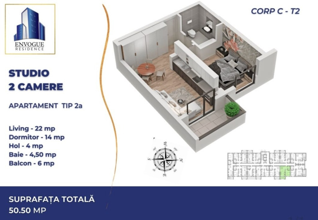Îți dorești să ai parte de intimitatea și funcționalitatea pe care ți le-ar oferi un apartament cu două camere, dar ești oarecum constrâns la capitolul buget? În ansamblul EnVogue Residence - Iuliu Maniu, din vestul Capitalei, găsești soluția optimă! Este vorba despre un apartament de tip studio, care, deși compartimentat în două camere, este mai compact decât unitățile bicamerale standard din cadrul proiectului nostru – și, deci, mai accesibil ca preț. Spre exemplu, proprietatea pe care ți-o propunem spre vânzare are o suprafață utilă de 50.5 metri pătrați. Unul dintre atuurile acestui apartament este dat de compartimentarea sa inteligentă: suntem siguri că te vei bucura pe deplin de livingul spațios, cu bucătărie deschisă, dar și de dormitorul intim, practic și funcțional. Programând o vizionare, vei descoperi că proprietatea se remarcă, bineînțeles, prin caracteristicile devenite deja obișnuință pentru clienții noștri, anume calitatea și siguranța construcției, în combinație cu finisajele din categoria premium. PLUS-VALOARE: Ne străduim în permanență să punem la dispoziția clienților noștri cele mai bune oferte financiare, astfel că făcând o achiziție EnVogue Residence - Iuliu Maniu te vei bucura de următoarele beneficii: • Asistență GRATUITĂ, din partea unui broker de credite profesionist, pentru cei interesați de accesarea unei finanțări bancare. • Reducere de 10% la mobila din magazinul Mobexpert Militari, la cumpărarea oricărei locuințe în cadrul EnVogue Residence - Iuliu Maniu.