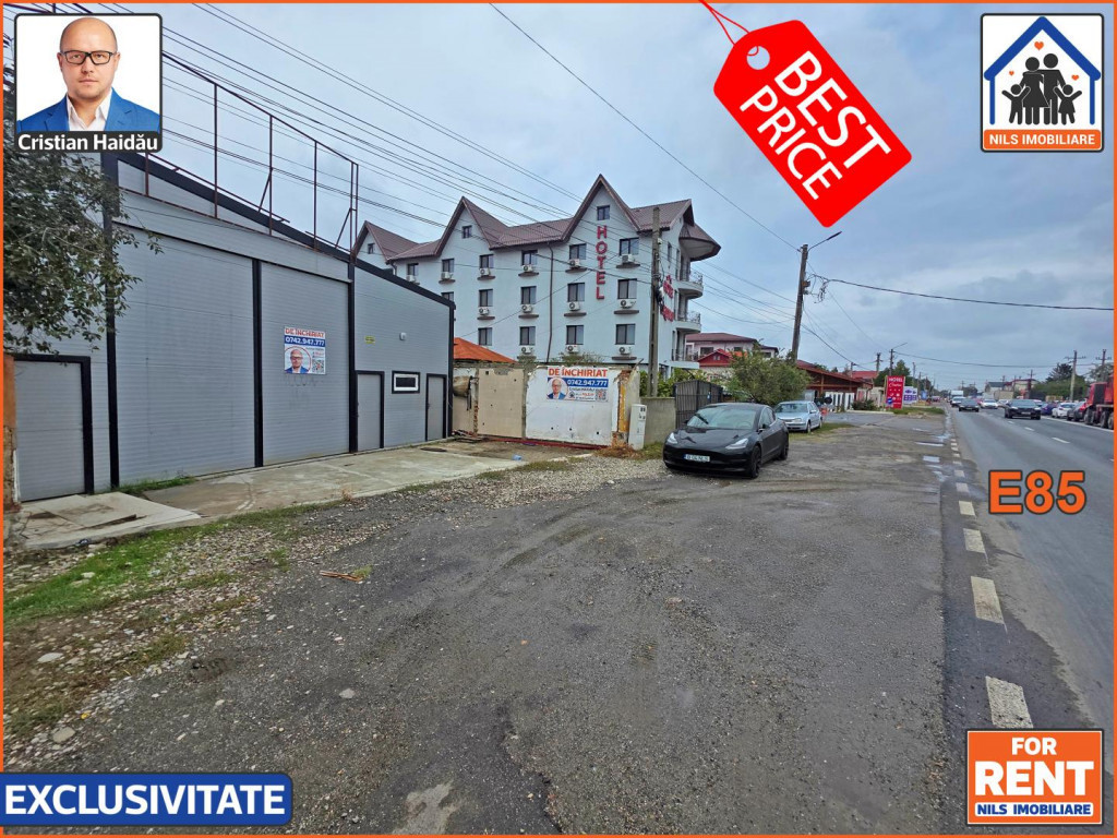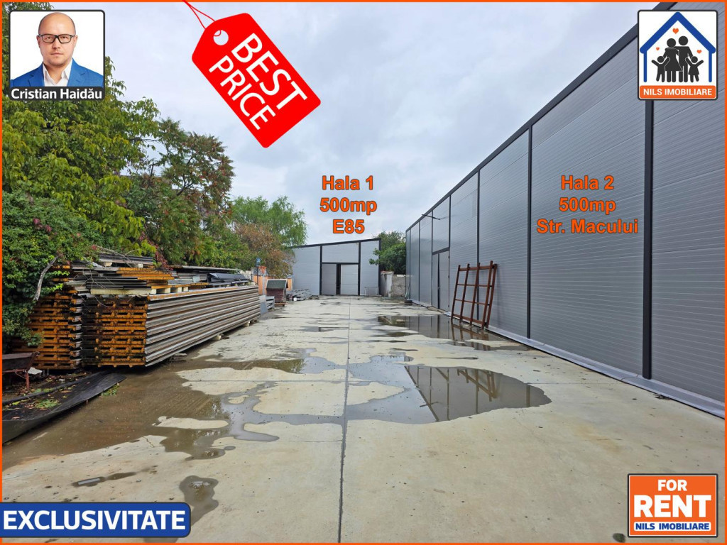 De inchiriat doua hale noi cu vizibilitate foarte buna la E85 in Afumati Ilfov. / Fiecare hala are 500mp (10x50) iar intre ele este o curte betonata de 700mp. / O hala are acces din E85 iar cealalta din strada Macului. / Pe site-ul NILS Imobiliare (nils. ro) gasiti video si tur virtual. / Ambele hale se inchiriaza cu 3250euro dar exista si posibilitatea inchirierii separate. Hala de la E85 se inchiriaza cu 3,8euro/mp = 1900euro iara hala din spate cu deschidere la strada Macului cu 3,2euro/mp = 1600 euro. Se adauga TVA. / Au acces TIR pe ambele parti, usi mari de 4m, grupuri sanitare, vestiare si utilitati. / Ideale pentru comert, depozitare, logistica, productie. / In Exclusivitate la NILS Imobiliare! /