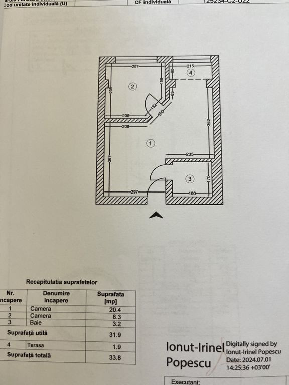 apartament tip studio, compartimentat conform releveului atasat(acte pregatite pentru vanzare imediata, certificat energetic clasa A), avand living deschis cu bucătăria, ideal atât pentru locuit, cât și pentru investiție (disponibil imediat dupa vanzare);beneficiază si de un loc de parcare generos(avand o suprafata mai mare decat standardul, permitand chiar si parcarea unei dubite, acesta fiind inclus in pretul de vanzare.