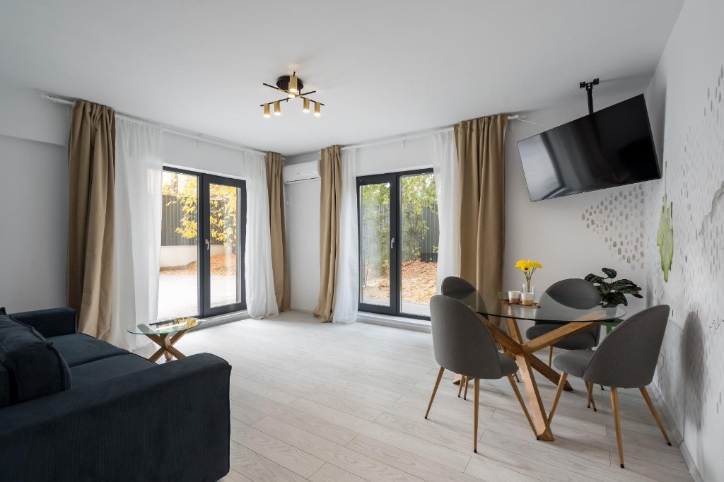 Apartament 3 camere cu terasă și grădină – The Class Apartments 3, Bd. Pipera Apartament cu 3 camere, situat în ansamblul rezidențial The Class Apartments 3, pe Bulevardul Pipera, într-o zonă liniștită, bine conectată și în plină dezvoltare. Clădirea este nouă, finalizată în 2023, și dispune de lift, subsol, parter și 4 etaje, oferind confort, siguranță și finisaje moderne. Apartamentul se află la parter și are o suprafață utilă de 68,9 mp, la care se adaugă o terasă și o grădină privată de 50 mp, rezultând o suprafață totală de 118,9 mp. Compartimentare: Living: 19,2 mp Bucătărie: 7,3 mp Dormitor 1: 13,8 mp Dormitor 2: 12,4 mp Baie 1: 4,2 mp Baie 2: 3,2 mp Hol intrare: 8,8 mp Apartamentul se vinde complet finisat, cu toate corpurile de iluminat incluse, bucătărie complet mobilată și utilată cu electrocasnice, și beneficiază de un loc de parcare inclus în preț. Cele două băi sunt amenajate modern, iar terasa și grădina oferă un spațiu generos, ideal pentru relaxare sau activități în aer liber. Locuința este ideală pentru cei care își doresc un apartament nou, luminos și funcțional, într-o zonă rezidențială modernă, cu acces rapid către Pipera, Aviației și zona de business din nordul capitalei.