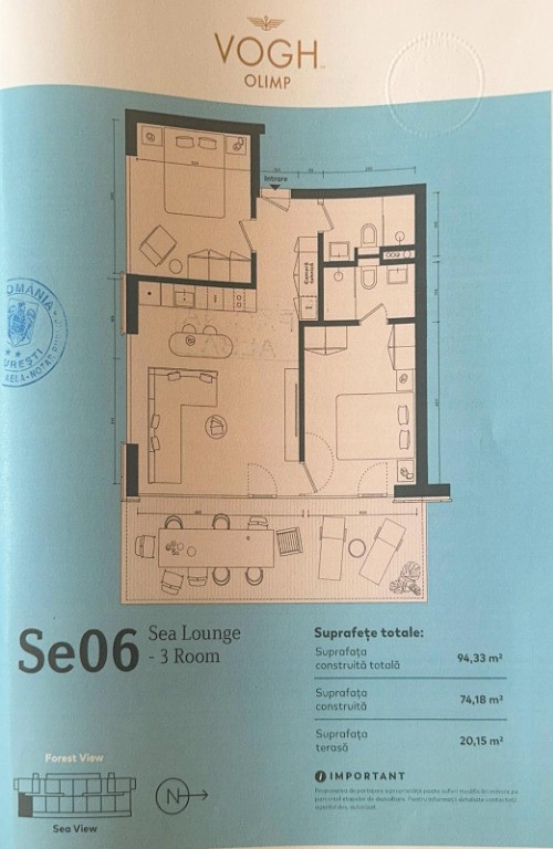 Apartament 3 camere, 2 băi, vedere la mare – complet mobilat – Vogh Olimp, Mangalia