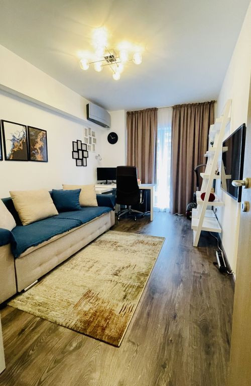 Camera centrala, menita a fi un birou, dispune de toate facilitatile necesare unei persoane care lucreaza de acasa, totodata este dotata cu canapea extensibila, SmartTV si dulap de depozitare.