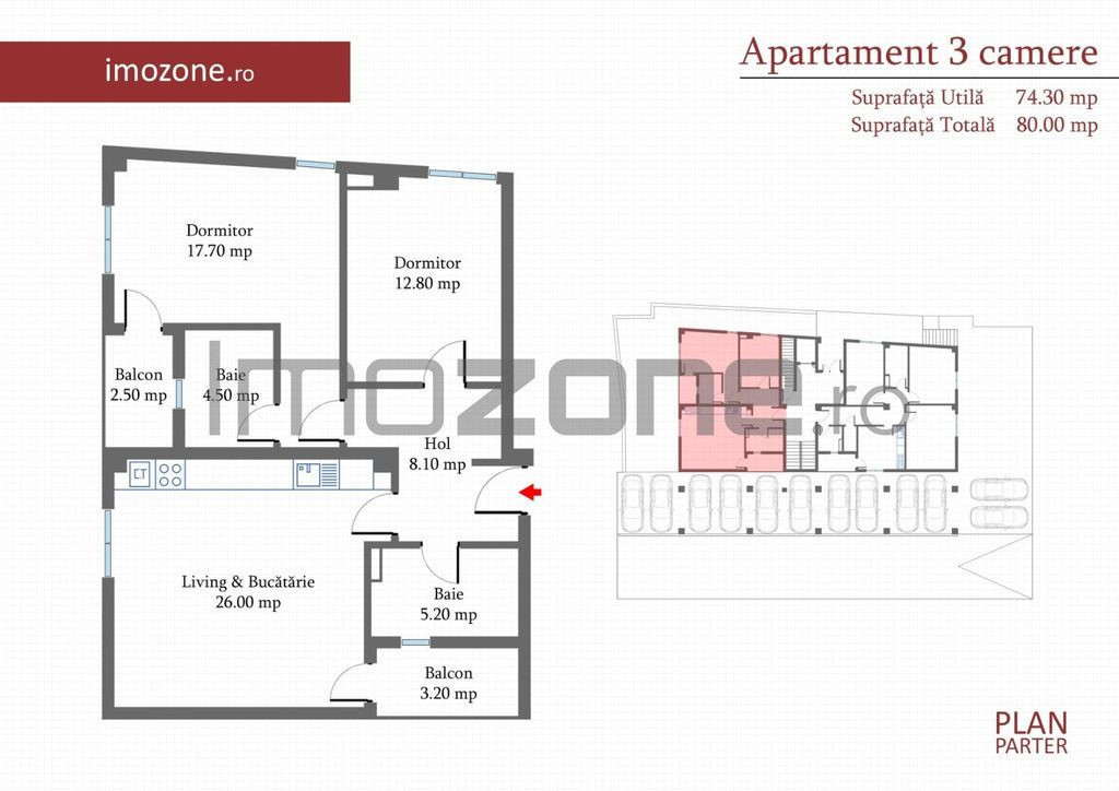 Apartament cu 3 camere, decomandat, disponibil la parter inalt, cu suprafata totala de 80 mp distribuita astfel: 2 dormitoare de 13 mp respectiv 17 mp,  2 bai -5mp si 4.5 mp,  living+bucatarie de 26 mp si un hol generos de 8 mp in care se poate amenaja mobilier pentru depozitare.
