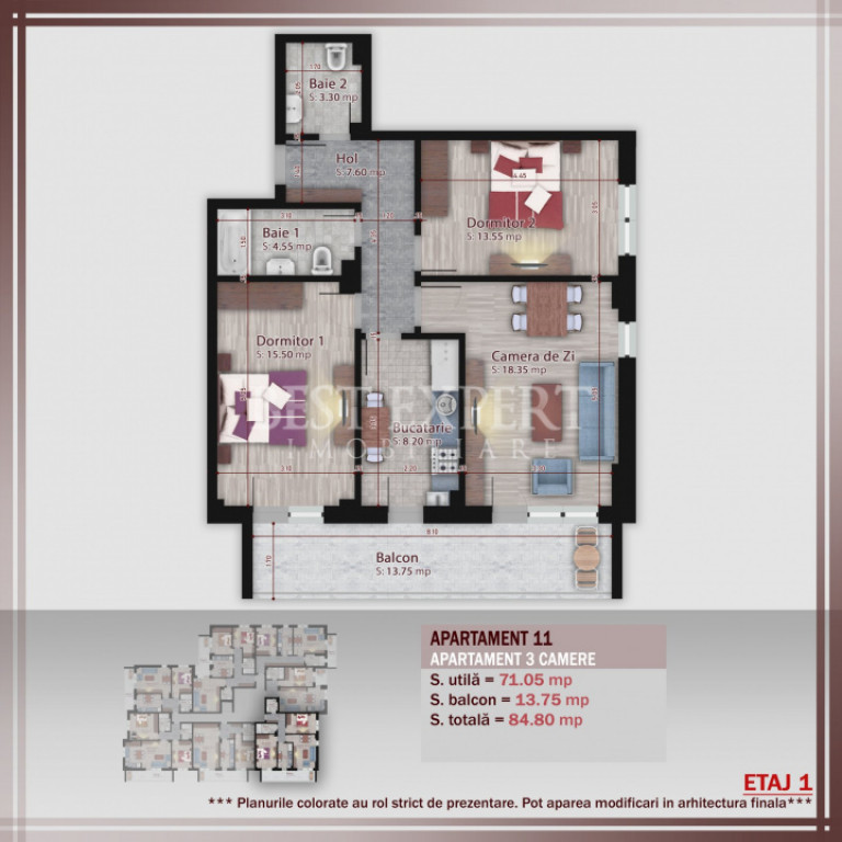 Suprafata utila -71.05 mp utili +.13.75 mp balcon, gradina 84.80 mp