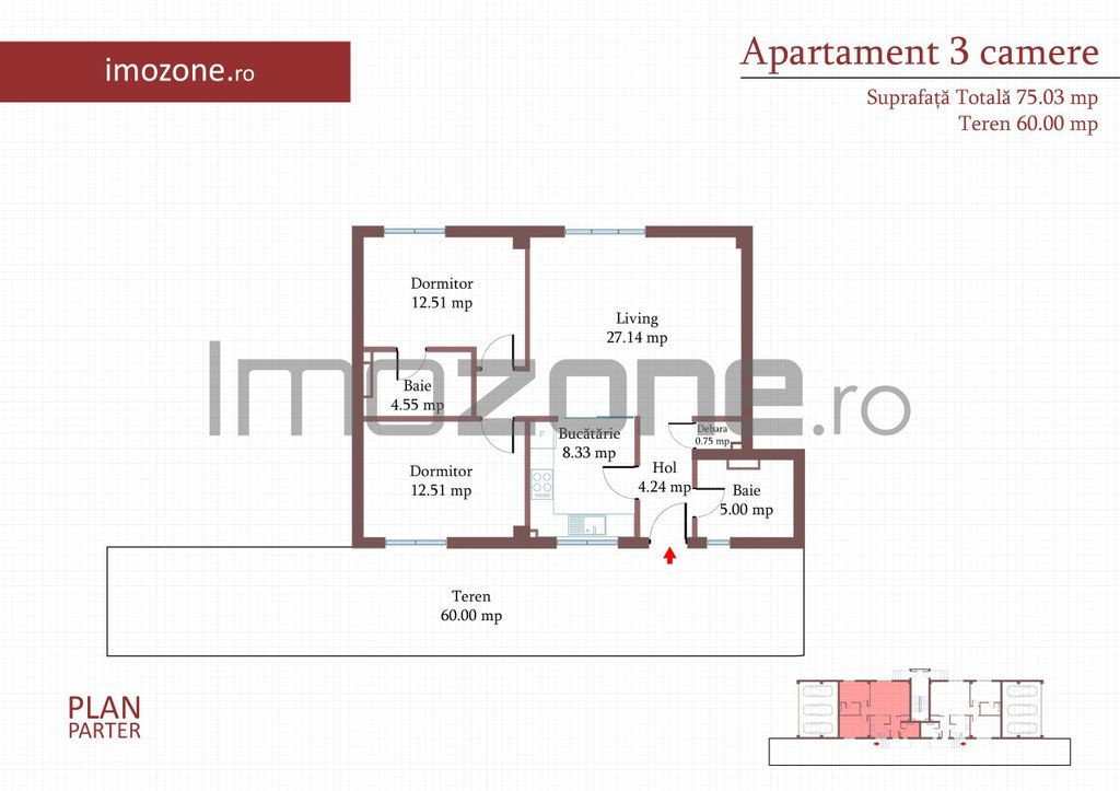 Proiect Rezidențial in Cartierul Militari Apartament cu 3 camere, 2 bai, teren propriu 67 mp, suprafata de 75 mp, finisat complet, cu posibilitatea de a alege finisajele, curte proprie dar si 2 locuri de parcare incluse in pret. FINISAJE & DOTARI: - compartimentari din zidarie cu pereti tencuiti si finisati cu lavabil alb - termoizolatie exterioara din vata bazaltica si polistiren cu grosime de 10 cm - centrala termica de apartament cu incalzire in pardoseala - tamplarie PVC cu geam tripan - kit pentru aparate de aer conditionat - videointerfon - gresie si faianta - parchet - usi interior din lemn - aparataj electric modular - baile sunt dotate cu obiecte sanitare - balcoane / terase finisate cu ceramica - instalatie electrica prevazuta pentru rulouri exterioare actionate electric Descoperiți oportunitatea de a vă realiza visul de a locui într-un proiect rezidențial tip boutique situat în cartierul Militari, unul dintre cele mai căutate zone din București unde veti gasi - proiect mic de inaltime (p+2E+3R) tip boutique cu numai 8 apartamente cu 2, 3 si 4 camere - locuri de parcare tip garaj (contracost) - acces facil in proiect, din doua strazi - zona linistita, verde si civilizata Avantajele locației: - Acces facil la principalele artere rutiere (Șoseaua București-Ploiești, Bulevardul Iuliu Maniu, strada Apuslui, etc.) - Proximitate față de stațiile de transport public (autobuz, troleibuz si, cel mai important, metrou) - Vecinătate cu parcuri și spații verzi - Acces rapid la centre comerciale, magazine și servicii (Piata Apusului, AFI Cotroceni, Militari Shopping Center, etc.) - Școli, grădinițe și instituții de învățământ în apropiere Zona: - Cartierul Militari este unul dintre cele mai căutate și apreciate zone rezidențiale din București - Oferă un mediu liniștit și sigur, perfect pentru familii și persoane care doresc să trăiască într-un cadru plăcut - Acces la o varietate de servicii și facilități (restaurante, cafenele, magazine, etc.) Proiectul: - Oferă locuințe moderne și confortabile, cu finisaje de calitate superioară - Acces controlat si supravegheat pentru siguranța și securitatea locuitorilor