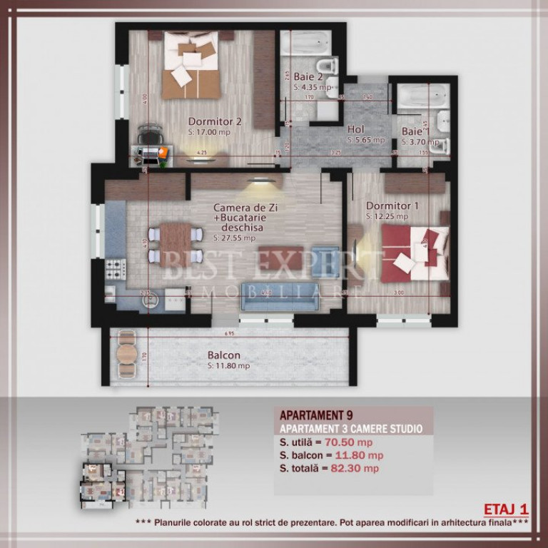 Suprafata utila -70.50 mp utili +.11.80 mp balcon, total 82.30 mp utili