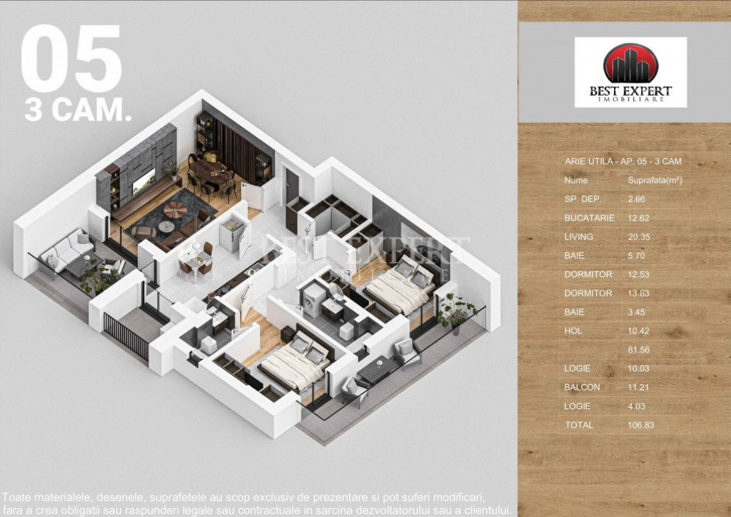 Oferta noastra completa o gasiti pe site-ul Best Expert Imobiliare Birou vanzari dezvoltator Titan-Pallady Comision 0% Sediu: Drumul Gura Crivatului, nr. 4-22, Sector 3 Waze: Best Expert Imobiliare Telefon Programari: 0741.531.808 Program vizionari: L-V 10:00-18:00 / S: 10:00-14:00 Facebook: Best Expert Imobiliare -163.000 Euro +TVA Pozitionare : zona Theodor Pallady Tip proprietate - Apartament 3 camere Tip imobil - parter+3 etaje Total unitati ansamblu - 160 unitati Termen Finalizare - FINALIZAT Suprafata utila -81.56 mp utili +25.27 mp balcon, total 106.83 mp utili Utilitati publice - curent, apa, canalizare, gaz Distanta mijloace de transport in comun: -5 minute - STB 253 si 330 -15 minute metrou N.Teclu Dotari -centrala -incalzire in pardoseala -finisaje la alegere - sistem de aspirare centralizat - sistem de ventilare cu recuperare de caldura -pompe de caldura - panouri fotovoltaice - tâmplarie PVC premium - aer conditionat - izolatie fonica ridicata -izolatie termica ridicata Id intern: P5005