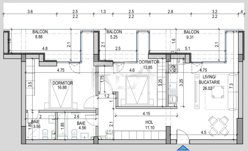 R.E.A. Imobiliare Apartament 3 camere, finisat, semidecomandat, orientat NORD, la etajul 5/5, într-un complex construit în anul 2021, in zona PIPERA. - Suprafata totala 99,40 mp: 75,96 mp utili+ 23,44 mp balcoane. - Configuratie: 2 dormitoare, living cu bucatarie open space, hol, 2 bai si 3 balcoane. - Incalzire prin calorifere, centrala proprie. - Pret loc de parcare acoperit 15.000 EUR + TVA. La un minut de mers cu masina de Scoala Americana sau Scoala Internationala Olga Gudynn. Vecinatatile la fel includ: AISB Early learning center, British School of Bucharest, British Fotball School, Mark Twain International School Junior Campus, World Class Atlantis, Echilibria Montessori Education. Pentru detalii si vizionari, vă rugăm să ne contactați, specificand codul de identificare P2892. Id intern: P2892