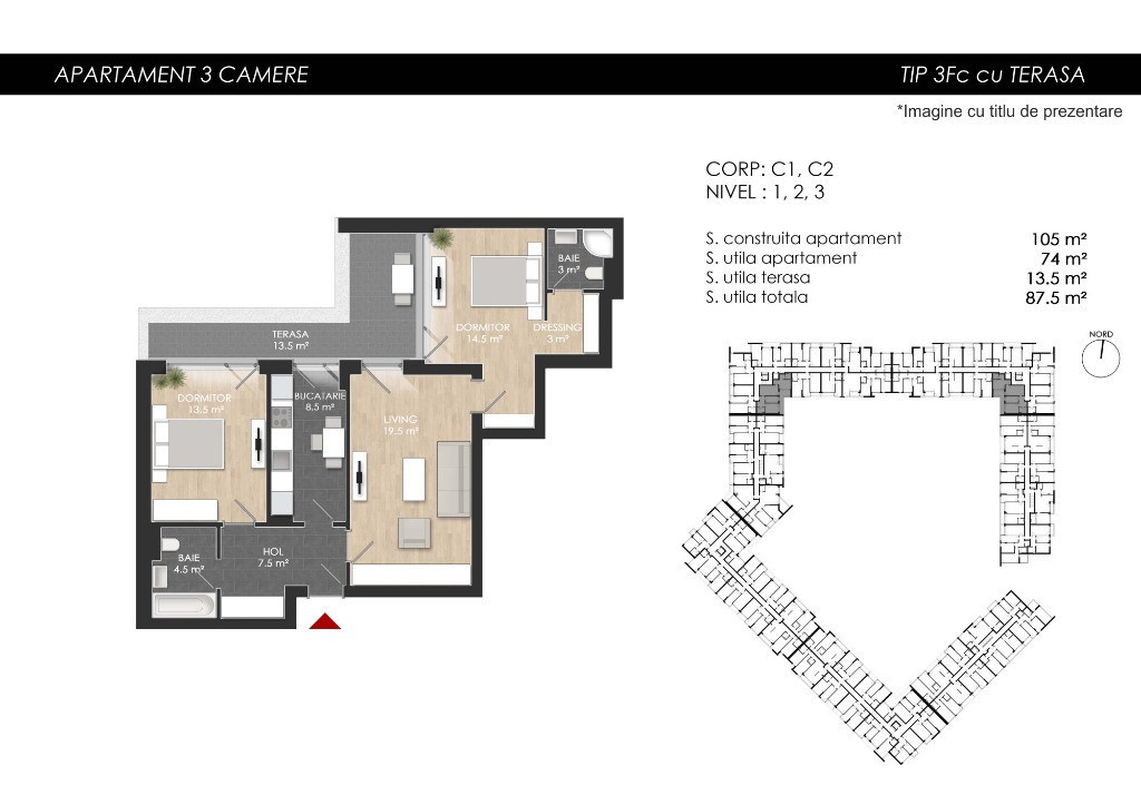 Apartamentul nr. 83, Finalizat, modelul 3Fc din Faza 3 de la Atria Urban Resort (Șos. Chitilei Nr. 242, București, Sect. 1). ** Se vinde finisat la cheie, utilat cu obiecte sanitare, nemobilat. *** Prețul este final. Compartimentare & Orientare: Apartamentul nr. 83 are o suprafata totala utila de 88 mp (include terasa de 13.5 mp) si este compus din: - 2 dormitoare: 17.5 mp SU (din care dressing de 3mp), respectiv 13.5 mp - Living: 19.5 mp SU - Bucatarie inchisa: 8.5 mp SU - Hol Acces: 7.5 mp SU - 2 bai : 4.5 mp SU (utilata cu obiecte sanitare si cada), respectiv 3 mp (cabina dus) - terasa in L: 13.5 mp Etaj : pozitionat la Etaj 1 în cladirea C2 (cu 6 etaje) Orientare : Vest, Sud Atria Urban Resort : proiect rezidential multiplu premiat, din zona de Nord a Bucurestiului, recunoscut si apreciat pentru raportul excelent calitate-pret, regimul mic de inaltime al cladirilor, regenerarea urbana cu sute de copaci plantati, o comunitate activa. Faza 3 a fost finalizată în Toamna 2024. Acesta respecta standardul nZEB – adica o casa cu consum de energie aproape de zero – Cladirile din Faza 3 sunt evaluate energetic A, s-au instalat aproape 300 de panouri solare care vor produce energie pentru incalzirea apei menajere, apartamentele vor fi dotate cu sisteme de ventilatie cu recuperatoare de caldura, iar izolatia termica a peretilor exteriori a fost marita. Faza 1 si Faza 2 sunt finalizate si locuite de peste 2 ani. 1800 de rezidenți, majoritatea familii tinere locuiesc deja în complexul rezidențial Atria Urban Resort. Atria Urban Resort este un complex rezidential inedit, cu regim mic de inaltime, cladiri de 4 etaje si 6 etaje, situat pe Soseaua Chitilei Nr 242, Sector 1, Bucuresti (chiar langa ATAC HiperDiscount by Auchan & Lacul Străulești. În vecinătate: Mall Collosseum cu restaurante, cinematograf, sala de fitness; școli, grădinițe, magazine). FINISAJE : Ferestre cu geam termopan: Profil PVC Salamander, tip Green Revolution MD cu geam tripan, deschidere oscilo-batante Stare interior: Nou – se va preda finisat la cheie Usi interior: Pinum Celulare, culoare alba, cu pervaz, feronerie cromata Usa intrare: Pinum Metalica, culoare alba Izolatii termice: Exterior Pereti interiori : pereti de caramida Porotherm de la Wienerberger + tencuiala mecanizata ; La bai peretii sunt din gipscarton. Podele: Gresie Kai de calitate superioara, Parchet laminat Egger – clasa 32 uz comercial, Incalzire in pardoseala Uponor cu agent termic Pereti: Faianta, Vopsea lavabila Intrerupatoare si prize: da – Legrand, siguranțe Gewiss Obiecte sanitare: da – Ideal Standard UTILITĂȚI: Utilitati generale: Curent, Apa, Canalizare, Gaz, CATV Sistem incalzire: Centrala termica proprie Bosh, Incalzire prin pardoseala Kermi Acces internet: Fibra optica DOTĂRI : Alte spatii utile: Gradina cu terasa Contorizare: Contor gaz, Apometre Mobilat: Nemobilat Dotari imobil: Spatii agrement, Piscina exterioara, Lift, Interfon, Acoperis, Parcuri comune, Locuri de joaca pentru copii, Alei, Spatii verzi libere Servicii imobil: Supraveghere video, bariera acces, paza umana Alte detalii zona : Amenajare strazi: Asfaltate ; Iluminat stradal ; Mijloace de transport in comun, supermarket, hipermarket, magazine, restaurante, piata, scoli, gradinita