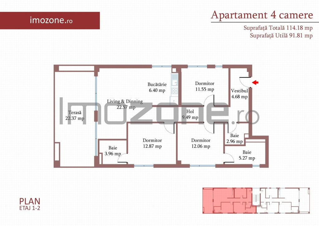 4 camere cu terasa de 22 mp, 3 bai, etaj 1/3, FINISAT MOD...