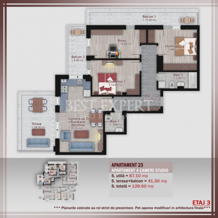 Suprafata utila -87.10 mp utili +.41.50 mp balcon, total 128.60 mp utili