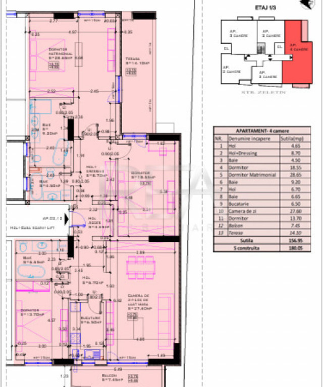 R.E.A. Imobiliare Apartament premium 4 camere | Nordul Capitalei, Sector 1, la câteva minute de Cartierul Francez, Parcul Herăstrău și Podul Băneasa, situat intr-un imobil boutique S+P+4 etaje + etaj retras prinde contur și va fi pregătit pentru locuire din 15 iulie 2025. Proiectul propune apartamente spațioase, decomandate, cu 2, 3 și 4 camere, configurate pentru un stil de viață urban rafinat. Avantaje ale amplasării Recreere & natură: Parcul Herăstrău la o plimbare scurtă, acces rapid spre Parcul Bordei și zonele verzi din Băneasa Educație: Școala Gimnazială Herăstrău, British School of Bucharest (Băneasa), grădinițe bilingve și after-school-uri de top Sănătate: Spitalul Regina Maria Băneasa, Ponderas Academic Hospital, Medicover Aviatorilor, clinici private și centre medicale de proximitate Business & shopping: Polul de birouri Pipera-Aviatorilor, Promenada Mall, Băneasa Shopping City, piețe agroalimentare și magazine gourmet Gastronomie & lifestyle: Restaurante în Cartierul Francez, cafenele de specialitate pe Bd. Aerogării, terase pe malul lacului Suprafață totală: 156,95 mp , Suprafață utilă 135,4 mp, terasă 14,10 mp, balcon 7,45 mp Configurație: living generos, 3 dormitoare, 3 băi, bucătărie separată, 3 holuri, dressing, terasă, balcon. Toate unitățile sunt livrate la stadiu de finisaj la alegerea viitorului proprietar, cu pachet personalizat prin parteneriatul Delta Studio (gresie, faianță, parchet, uși interioare, obiecte sanitare, plintă). Performanță constructivă Structură: cadre din beton armat B400, zidărie exterioară & interioară Porotherm Austria, fier beton de calitate superioară Anvelopă: fațadă decorativă CAPAROL Dalmatina Ignifug, balcoane cu sticlă securizată dublă Tâmplărie: profil PVC 7 camere, geam tripan cu protecție UV și izolare fonică sporită Înălțime liberă: 2,85 m în camere, senzație veritabilă de spațiu Dotări interioare premium Încălzire în pardoseală TECCE (Germany), centrală termică proprie pentru fiecare apartament Instalație electrică GEWISS; sistem de canalizare antifonat Uși de intrare metalice Safe, închidere în 3 puncte (valoare 4.500 lei) Glafuri și pardoseală pe holuri din granit & marmură Lift Schindler (6 persoane) deja funcțional Contorizare individuală 100 % pentru apă, gaz și electricitate Facilități suplimentare Parcări subterane disponibile la 20.000 EUR + TVA, acces securizat Rute rapide către DN 1, Aeroportul Otopeni și viitoarea linie de metrou M6 Se acceptă orice modalitate de plată Pentru detalii si vizionari, contactati-ne specificand codul de identificare P7777. Id intern: P7777