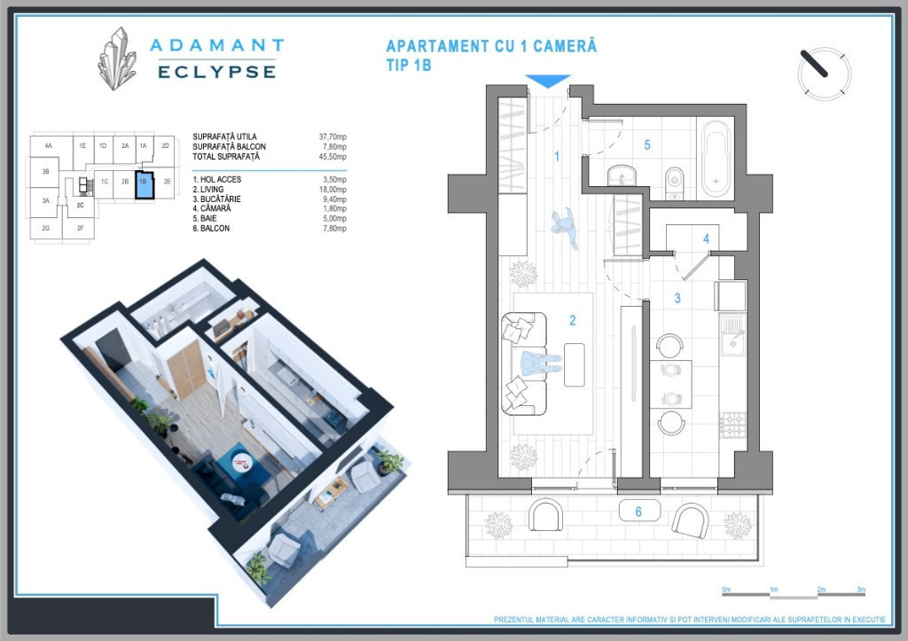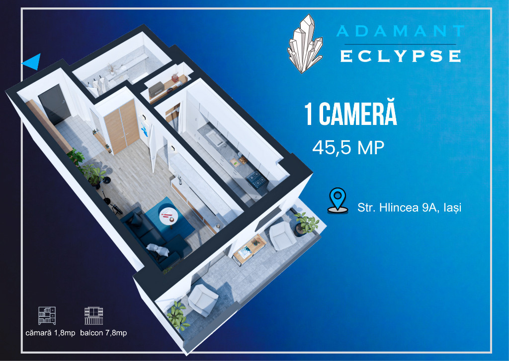 Apartamentul propus spre vanzare este situat la etajul 2 din 8, orientat către Sud, decomandat, are o cămară de 1,8mp, cu o suprafata utila de 37,7mp plus un balcon tip terasa de 7,8mp. Proiectul beneficiază de o locație perfectă, ferită de zgomotul urban, cu priveliște către pădurea Cetățuia (zona CUG - Iași, pe strada Hlincea, în planul 2 la bulevard), fiind în același timp excelent conectat la facilitățile orașului: școală lângă complex, grădinițe în apropiere, stații de transport public la 2 minute de mers pe jos, supermarketuri, magazine, farmacii etc. Complexul ofera mai multe facilitati, printre care amintim: loc de joaca pentru copii, parcari subterane si supraterane (contra cost), spatii comerciale, spatii verzi pentru relaxare, acces securizat. Dotări și finisaje: 2 ascensoare de ultimă generație tâmplărie PVC 6 camere tripan, sticlă 4 season aparat de aer condiționat centrală termică în condensare băi echipate cu obiecte sanitare gresie, faianță din import parchet, uși interior calitate superioară casa scării amenajată în stil modern: pardoseli gresie, balustrade metalice. Detalii construcție: Structură pe cadre; Fundații de tip radier general; Structură din beton clasa C30/37; Zidărie BCA; Izolație cu vată bazaltică; Apartament 1 camera, tip 1B, decomandat, suprafață totală 45,5 mp, suprafață utilă 37,7mp, suprafata balcon 7,8mp, compartimentat astfel: hol = 3,5mp, living = 18mp, bucatarie = 9,4mp, baie = 5mp. Apartamentul beneficiaza si de un spatiu de depozitare (camara) in suprafata de 1.8 mp, cu acces din bucatarie. Preț PROMOȚIONAL - 74.880 euro + TVA - plata integrala - 76.960 euro + TVA - avans 80% la antecontract si diferenta la predare Nu lăsa această oportunitate să îți scape! Contactează-ne astăzi și programează o întâlnire la biroul nostru de vânzări situat pe sos. Nicolina, nr.54.