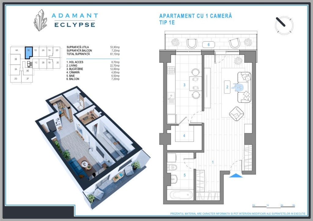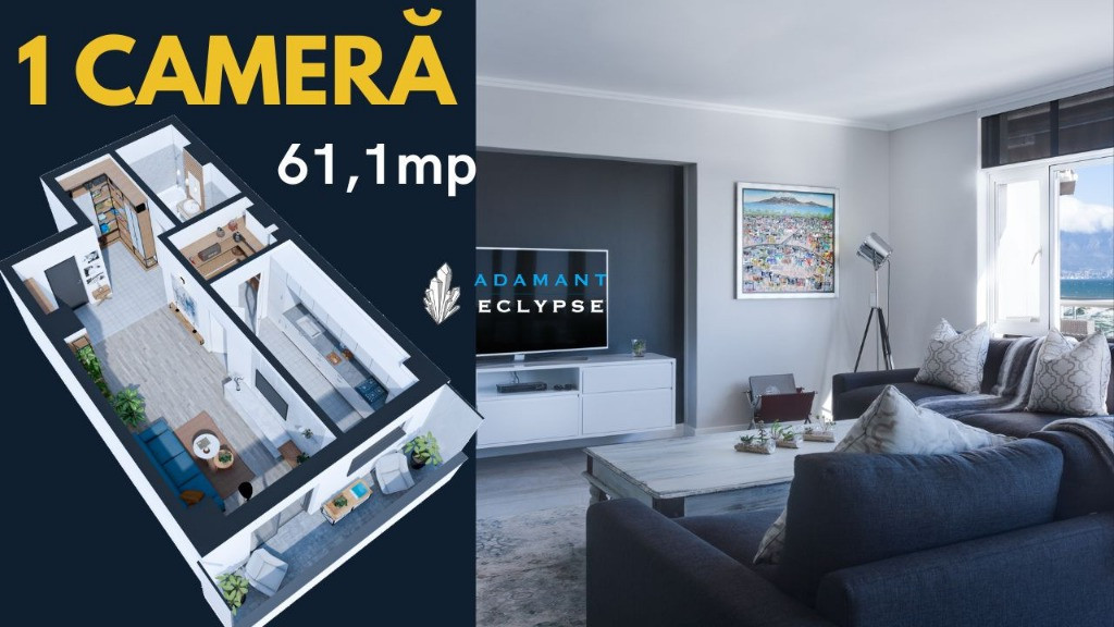 ADAMANT ECLYPSE - un complex de apartamente în care confortul și designul modern se întâlnesc pentru a-ți oferi stilul de viață pe care îl meriți! Indiferent dacă visezi la un apartament cozy sau la un spațiu generos, găsești variante de 1, 2, 3 și 4 camere, decomandate și open space, cu suprafețe între 44,3mp și 102,9mp. Amplasat strategic în zona CUG - Iași, pe strada Hlincea, în planul 2 la bulevard, beneficiezi de o locație liniștită și accesibilă, perfectă pentru a te bucura de viața urbană într-un mediu relaxant și prietenos. Detalii construcție: Structură pe cadre; Fundații de tip radier general; Structură din beton clasa C30/37; Zidărie BCA; Izolație cu vată bazaltică; Dotări și finisaje: 2 ascensoare de ultimă generație tâmplărie PVC 6 camere tripan, sticlă 4 season aparat de aer condiționat centrală termică în condensare băi echipate cu obiecte sanitare gresie, faianță din import parchet, uși interior calitate superioară casa scării amenajată în stil modern: pardoseli gresie, balustrade metalice. Facilități complex care îți transformă fiecare zi într-o experiență plăcută: acces securizat, video interfon, iluminat exterior, sistem de parcare subterană și supraterană, spații comerciale la parter. Apartament 1 camera, tip 1E, decomandat, suprafață totală 61,1 mp, suprafață utilă 53,9mp, suprafata balcon 7,2mp, compartimentat astfel: hol = 8,7mp, living = 22,7mp, bucatarie = 12mp, baie = 6,5mp. Apartamentul beneficiaza si de un spatiu de depozitare (camara) in suprafata de 4 mp, cu acces din bucatarie. Preț - 103.500 euro + TVA - plata integrala - 106.375 euro + TVA - 80% avans avans la antecontract si diferenta la predare; - 109.250 euro + TVA - 50% avans avans la antecontract si diferenta la predare; - 115.000 euro + TVA - 30% avans avans la antecontract si diferenta la predare; Nu lăsa această oportunitate să îți scape! Contactează-ne astăzi și programează o întâlnire la biroul nostru de vânzări situat pe sos. Nicolina, nr.54.