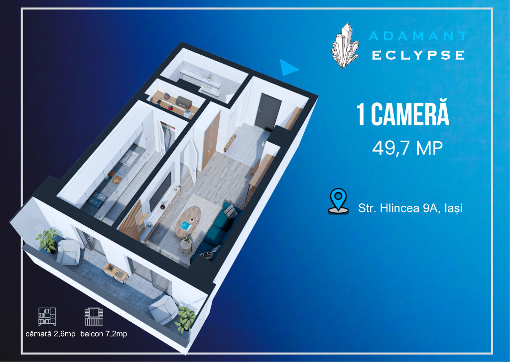 Apartament 1 cameră, tip 1D, 49.7 mp, decomandat, cu balcon tip terasa de 7,2 mp și spațiu de depozitare de 2,6mp. Adamant Eclypse – Zona Nicolina-CUG, str. Hlincea, în planul 2 față de șoseaua principală, ferit de agitația urbană, dar cu acces rapid către toate zonele importante ale Iașului. Stadiu actual al construcției: s-a finalizat execuția primelor radiere. Facilități și avantaje ale complexului Adamant Eclypse: ✔️ Loc de joacă pentru copii ✔️ Parcări subterane și supraterane ✔️ Spații comerciale în incintă ✔️ Spații verzi amenajate ✔️ Acces securizat ✔️ Școală și grădinițe în apropiere ✔️ Stații de transport public la 2 minute ✔️ Supermarketuri și farmacii la îndemână Preț - 82.980 euro + TVA - plata integrala - 85.285 euro + TVA - 80% avans la antecontract si diferenta la predare; - 87.590 euro + TVA - 50% avans la antecontract si diferenta la predare; Nu lăsa această oportunitate să îți scape! Contactează-ne astăzi și programează o întâlnire la biroul nostru de vânzări situat pe sos. Nicolina, nr.54.