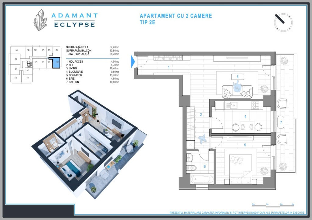 Descoperă confortul și funcționalitatea acestui apartament decomandat, cu geam la baie! Cu o suprafață totală de 68,2 mp și un balcon generos de 10,8 mp, acest apartament oferă tot ce ai nevoie pentru un stil de viață modern și confortabil. Detalii apartament: Suprafață utilă: 57,4 mp Compartimentare: Hol intrare (4,5 mp), Living (19,4 mp), Hol (5,7 mp), Bucătărie (9,5 mp), Dormitor (13,7 mp), Baie (4,6 mp) Facilități Complex: Loc de joacă pentru copii Parcări subterane și supraterane (contra cost) Spații comerciale Spații verzi pentru relaxare Acces securizat Școală și grădinițe în apropiere Stații de transport public la 2 minute de mers pe jos Supermarketuri, magazine și farmacii. Amplasat strategic în zona CUG - Iași, pe strada Hlincea, în planul 2 la bulevard, beneficiezi de o locație liniștită și accesibilă, perfectă pentru a te bucura de viața urbană într-un mediu relaxant și prietenos. Detalii construcție: Structură pe cadre; Fundații de tip radier general; Structură din beton clasa C30/37; Zidărie BCA; Izolație cu vată bazaltică; Dotări și finisaje: 2 ascensoare de ultimă generație tâmplărie PVC 6 camere tripan, sticlă 4 season aparat de aer condiționat centrală termică în condensare băi echipate cu obiecte sanitare gresie, faianță din import parchet, uși interior calitate superioară casa scării amenajată în stil modern: pardoseli gresie, balustrade metalice. Modalitati de plata: - 113.040 euro+TVA - plata integrala - 116.180 euro +TVA - 80% avans la antecontract si diferenta la predare - 119.320 euro + TVA - 50% avans la antecontract si diferenta la predare - 125.600 euro + TVA - 30% avans la antecontract si diferenta la predare Nu lăsa această oportunitate să îți scape! Contactează-ne astăzi și programează o întâlnire la biroul nostru de vânzări situat pe sos. Nicolina, nr.54.