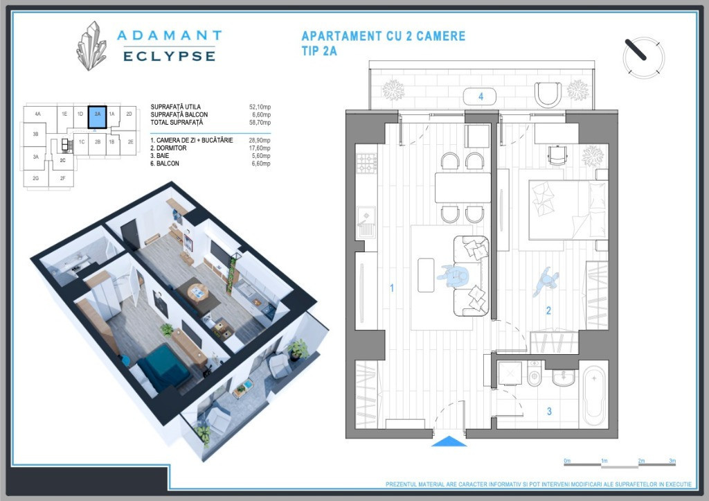 ADAMANT ECLYPSE - un complex de apartamente în care confortul și designul modern se întâlnesc pentru a-ți oferi stilul de viață pe care îl meriți! Apartamentul propus spre vanzare este situat la etajul 8 din 8, este tip open space, cu o suprafata utila de 52,1mp plus un balcon tip terasa de 6,6mp, compartimentat astfel: living + bucatarie = 28,9mp, dormitor = 17,6mp, baie = 5,6mp. Apartamentul va fi complet finisat si dotat cu centrala termica de apartament, aer conditionat, tamplarie de calitate, gresie din import. Complexul este situat in Iasi, zona Nicolina-CUG pe strada Hlincea, in planul 2 de la soseaua Nicolina. Proiectul este amplasat intr-o zona linistita, fiind ferit de zgomotul urban, insa in acelasi timp, cu acces facil catre toate punctele cheie ale Iasului. Complexul ofera mai multe facilitati, printre care amintim: loc de joaca pentru copii, parcari subterane si supraterane, spatii comerciale, spatii verzi pentru relaxare, acces securizat, scoala langa complex, gradinite in apropiere, statiile pentru mijlocul de transport in comun se afla la 2 min distanta de mers pe jos, supermarketuri, magazine, farmacii, etc. Modalitati de plata: 99.720 euro + TVA - plata integrala 102.490 euro + TVA - avans 80% la antecontract si diferenta la predare 105.260 euro + TVA - avans 50% la antecontract si diferenta la predare 110.800 euro + TVA - avans 30% la antecontract si diferenta la predare Termenul de predare al complexului va fi incepand cu martie 2026. Nu lăsa această oportunitate să îți scape! Contactează-ne astăzi și programează o întâlnire la biroul nostru de vânzări situat pe sos. Nicolina, nr.54.