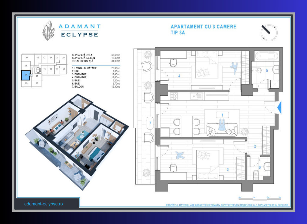 Apartament 3 camere, tip 3A, propus spre vânzare, situat la etajul 2 din 8, tip open space, cu o suprafață utilă de 69,6mp plus un balcon tip terasa de 12,3mp, având 2 dormitoare și 2 băi. Apartamentul este conceput pentru confort și funcționalitate și se predă finisat la cheie cu gresie și faianță în băi și bucătării, parchet în camere, usi interior, bai echipate cu obiecte sanitare, tavane Barrisol, centrala termica proprie, usa metalica, videointerfon, tamplarie PVC. Un proiect modern amplasat într-o zonă liniștită din Iași: Nicolina-CUG pe strada Hlincea, in planul 2 de la sosea, departe de agitația urbană însă, în același timp, cu acces facil către punctele cheie ale orașului. Complexul îți oferă facilități importante de care ai nevoie pentru un stil de viață echilibrat: locuri de joacă pentru cei mici, parcări subterane și supraterane, spații comerciale, spații verzi pentru relaxare, acces securizat, școală lângă complex, grădinițe în proximitate, stațiile de transport public la 2 minute de mers pe jos, supermarketuri, magazine, farmacii, etc. Modalitati de plata: - 136.350 euro + TVA - pret plata integrala - 140.130 euro + TVA - 80% avans la antecontract si diferenta la predare - 143.925 euro + TVA - 50% avans la antecontract si diferenta la predare - 151.500 euro + TVA - 30% avans la antecontract si diferenta la predare Nu lăsa această oportunitate să îți scape! Contactează-ne astăzi și programează o întâlnire la biroul nostru de vânzări situat pe sos. Nicolina, nr.54.