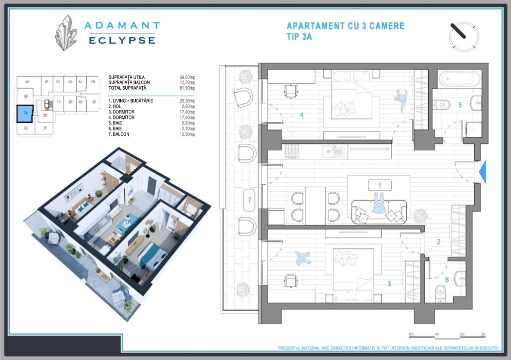 ADAMANT ECLYPSE - un complex de apartamente cu 1,2, 3 si 4 camere, cu suprafețe între 44,3mp și 102,9mp, în care confortul și designul modern se întâlnesc pentru a-ți oferi stilul de viață pe care îl meriți. Cu o suprafață totală de 81,9 mp, acest apartament cu 3 camere este alegerea ideală pentru cei care vor confort și spațiu. Situat la etajul 2 din 8, acest tip de apartament oferă o compartimentare practica: 2 dormitoare luminoase, 2 băi moderne, un living open space și un balcon tip terasă de 12,3 mp. Se predă la cheie, cu toate finisajele incluse: gresie și faianță în băi și bucătărie, parchet în camere, tavane decorative tip Barrisol, centrală termică proprie, videointerfon, tâmplărie PVC și obiecte sanitare montate – tot ce ai nevoie ca să te muți fără griji! Apartamentul face parte dintr-un proiect rezidențial modern, amplasat într-o zonă retrasă și liniștită din Nicolina-CUG, Iași, pe strada Hlincea – ferit de agitația orașului, dar cu acces rapid către toate punctele cheie. În complex beneficiezi de: • Loc de joacă pentru copii • Parcări subteranADAMANT ECLYPSE - un complex de apartamente în care confortul și designul modern se întâlnesc pentru a-ți oferi stilul de viață pe care îl meriți! Indiferent dacă visezi la un apartament cozy sau la un spațiu generos, găsești variante de 1, 2, 3 și 4 camere, decomandate și open space, cu suprafețe între 44,3mp și 102,9mp. Amplasat strategic în zona CUG - Iași, pe strada Hlincea, în planul 2 la bulevard, beneficiezi de o locație liniștită și accesibilă, perfectă pentru a te bucura de viața urbană într-un mediu relaxant și prietenos. Detalii construcție: Structură pe cadre; Fundații de tip radier general; Structură din beton clasa C30/37; Zidărie BCA; Izolație cu vată bazaltică; Dotări și finisaje: 2 ascensoare de ultimă generație tâmplărie PVC 6 camere tripan, sticlă 4 season aparat de aer condiționat centrală termică în condensare băi echipate cu obiecte sanitare gresie, faianță din import parchet, uși interior calitate superioară casa scării amenajată în stil modern: pardoseli gresie, balustrade metalice. Facilități complex care îți transformă fiecare zi într-o experiență plăcută: acces securizat, video interfon, iluminat exterior, sistem de parcare subterană și supraterană, spații comerciale la parter. Apartament 3 camere, tip 3A, openspace, suprafață totală 81,9mp, suprafață utilă 69,6mp, suprafata balcon 12,3mp, compartimentat astfel: hol = 2mp, living+bucatarie = 25,3mp, dormitor 1 = 17mp, dormitor 2 = 17,4mp, baie = 5,2mp, baie serviciu = 2,7mp. Modalitati de plata: - 136.350 euro + TVA - plata integrala - 140.130 euro + TVA - 80% avans la antecontract si diferenta la predare; - 143.925 euro + TVA - 50% avans la antecontract si diferenta la predare; - 151.500 euro + TVA - 30% avans la antecontract si diferenta la predare Nu lăsa această oportunitate să îți scape! Contactează-ne astăzi și programează o întâlnire la biroul nostru de vânzări situat pe sos. Nicolina, nr.54.e și supraterane • Spații comerciale în incintă • Spații verzi amenajate • Acces securizat și supraveghere video • Școală și grădinițe în apropiere • Stații de transport public la 2 minute • Supermarketuri și farmacii în vecinătate În acest moment, complexul se află în stadiul de construcție, la etapa de structură. Termenul de finalizare va fi incepand cu anul 2026.