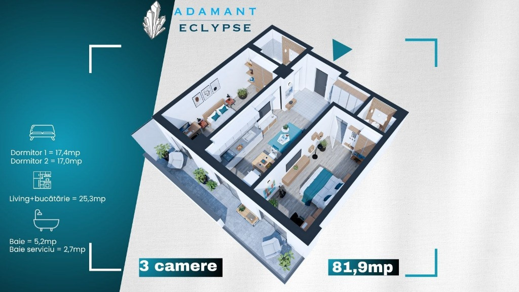 ADAMANT ECLYPSE - un complex de apartamente în care confortul și designul modern se întâlnesc pentru a-ți oferi stilul de viață pe care îl meriți! Indiferent dacă visezi la un apartament cozy sau la un spațiu generos, găsești variante de 1, 2, 3 și 4 camere, decomandate și open space, cu suprafețe între 44,3mp și 102,9mp. Amplasat strategic în zona CUG - Iași, pe strada Hlincea, în planul 2 la bulevard, beneficiezi de o locație liniștită și accesibilă, perfectă pentru a te bucura de viața urbană într-un mediu relaxant și prietenos. Detalii construcție: Structură pe cadre; Fundații de tip radier general; Structură din beton clasa C30/37; Zidărie BCA; Izolație cu vată bazaltică; Dotări și finisaje: 2 ascensoare de ultimă generație tâmplărie PVC 6 camere tripan, sticlă 4 season aparat de aer condiționat centrală termică în condensare băi echipate cu obiecte sanitare gresie, faianță din import parchet, uși interior calitate superioară casa scării amenajată în stil modern: pardoseli gresie, balustrade metalice. Facilități complex care îți transformă fiecare zi într-o experiență plăcută: acces securizat, video interfon, iluminat exterior, sistem de parcare subterană și supraterană, spații comerciale la parter. Apartament 3 camere, tip 3A, openspace, suprafață totală 81,9mp, suprafață utilă 69,6mp, suprafata balcon 12,3mp, compartimentat astfel: hol = 2mp, living+bucatarie = 25,3mp, dormitor 1 = 17mp, dormitor 2 = 17,4mp, baie = 5,2mp, baie serviciu = 2,7mp. Preț plata integrala - 136.350 euro + TVA - 140.130 euro + TVA - 80% avans la antecontract si diferenta la predare; - 143.925 euro + TVA - 50% avans la antecontract si diferenta la predare; - 151.500 euro + TVA - 30% avans la antecontract si diferenta la predare; Nu lăsa această oportunitate să îți scape! Contactează-ne astăzi și programează o întâlnire la biroul nostru de vânzări situat pe sos. Nicolina, nr.54.