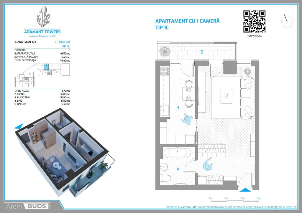 Apartament finalizat de 1 cameră 46.4mp, decomandat, situat la etajul 6 din 10 din blocul 1 cu o suprafaţă utilă de 41 mp si un balcon tip terasă de 5.4mp. Situat în Șos. Nicolina 54, în zona CUG – Rond Vechi Iași, complexul se află la doar 7-8 minute de Palas Mall, oferă acces ușor la stații de transport public (vizavi de complex), piață alimentară, grădinițe, supermarket-uri. Acesta este echipat cu: încălzire prin pardoseală, tavane Barrisol, tâmplărie PVC de înaltă calitate, aer condiționat, baie și bucătărie cu gresie din import, obiecte sanitare premium. Facilități complex: spații comerciale, sală de fitness, spații verzi, parcare subterană, acces securizat, iluminare ambientală la exterior. Preț 83.030 euro + TVA - plata avans 100%