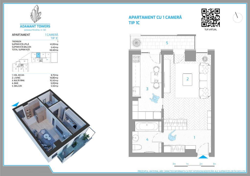 Apartament finalizat de 1 cameră 46.4mp, decomandat, situat la etajul 8 din 10 din blocul 1 cu o suprafaţă utilă de 41 mp si un balcon tip terasă de 5.4mp. Situat în Șos. Nicolina 54, în zona CUG – Rond Vechi Iași, complexul se află la doar 7-8 minute de Palas Mall, oferă acces ușor la stații de transport public (vizavi de complex), piață alimentară, grădinițe, supermarket-uri. Acesta este echipat cu: încălzire prin pardoseală, tavane Barrisol, tâmplărie PVC de înaltă calitate, aer condiționat, baie și bucătărie cu gresie din import, obiecte sanitare premium. Facilități complex: spații comerciale, sală de fitness, spații verzi, parcare subterană, acces securizat, iluminare ambientală la exterior. Preț 83.030 euro + TVA - plata integrala