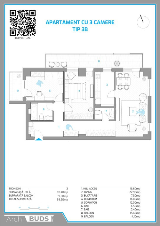 Apartament 3 camere, tip 3B, decomandat, suprafata 99,90 mp, compartimentat astfel: - hol acces 16,50mp - living 22,90mp - bucatarie 7,30mp - dormitor 14,80mp - dormitor 12,00mp - baie 4,50mp - baie 2,40mp - balcon 15,40mp - balcon 4,10mp Acesta este echipat cu: încălzire prin pardoseală, tavane Barrisol, tâmplărie PVC de înaltă calitate, aer condiționat, baie și bucătărie cu gresie din import. Facilități complex: spații comerciale, sală de fitness, spații verzi, parcare subterană, acces securizat, iluminare ambientală la exterior. Poziționarea avantajoasă a complexului (pe Șos. Nicolina 54, CUG – Rond Vechi) aduce numeroase beneficii, precum: stații de transport public vizavi, grădinițe în proximitate, piață alimentară, magazine, supermarketuri, farmacii, și alte facilități esențiale fiind aproape de punctele cheie ale orașului și la doar 5 minute de complexul Palas Mall. Preț plata intregrala: - 157.760 euro + TVA Pentru platile cu avans, metoda de calcul este urmatoarea: -1750 euro/mp+TVA calculat la valoarea avansului achitat la antecontract, iar diferenta se calculeaza la 1900 euro/mp + TVA. Nu lăsa această oportunitate să îți scape! Contactează-ne astăzi și programează o vizionare la biroul nostru de vânzări situat pe sos. Nicolina, nr.54.