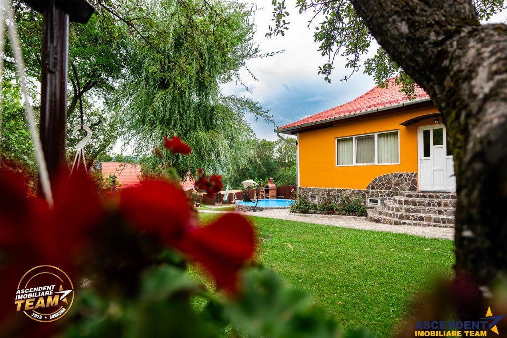 Comision cumparator: 0% din valoarea de tranzactionare. ASCENDENT IMOBILIARE este onorata sa va propuna spre vanzare, in REPREZENTARE EXCLUSIVA, o oaza de confort si frumusete din inima Transilvaniei, localizata in Satul Lutoasa, judetul Covasna. Va invitam sa experimentati o vizionare initiala, din locatia unde va aflati, chiar acum, prin accesarea filmului de prezentare si a turului virtual: Film prezentare: https://www.youtube.com/watch?v=PcyETotduuM Tur virtual tridimensional: https://my.matterport.com/show/?m=JV8tYH1q7hh Situata intr-o zona inconjurata de verdeata si aer curat, la doar 16 km de orasul Targu Secuiesc, aceasta proprietate reprezinta o oportunitate exceptionala pentru a va bucura de un spatiu generos de locuit, dar si cu posibilitati de relaxare, fie la interior, in salonul spatios dotat cu masa de biliard, masa de pingpong, darts, fie in curtea cu piscina. In momentul in care pasiti in aceasta rezidenta, veti fi intampinati de o atmosfera calda si primitoare, care va face sa va simtiti acasa. Prima casa cuprinde un hol, baie, bucatarie si trei camere. Pivnita este folosita ca si camera technica, dar are spatiu si pentru depozitare. A doua casa are doua niveluri, cu hol, bucatarie, baie si living pe parter, hol mare si un dormitor pe etaj. Livingul spatios tip salon de 64 mp ofera posibilitatea de a distra grupuri mai mari. Proprietatea contine o piscina exterioara incalzita cu spatiu amenajat pentru sezlonguri, foisor, leagane, gratar, fantana arteziana decorativa. Gradina are gazon perfect, cu arbori decorativi, un sistem de iluminat feeric care creaza un cadru idilic. Anexa are doua camere cu spatiu mare de depozitare. Invitam colegii la colaborare, onoram agentul/ agentia partenera cu comisionul aferent! Contactati-ne pentru a programa o vizionare si a descoperi toate secretele acestei locatii. Consultant dedicat acestei oferte: Domnul: Zoltan Bajka Telefon/ WhatsApp: 0750.497.050 Detalii, fotografii suplimentare, precum si alte variante similare exclusive: www.ascendentimobiliare.ro