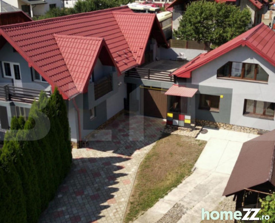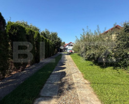 Proprietatea este împrejmuită cu gard din fier forjat și beneficiază de o curte mare, frumos amenajată, ideală pentru relaxare, dar și pentru activități comerciale.