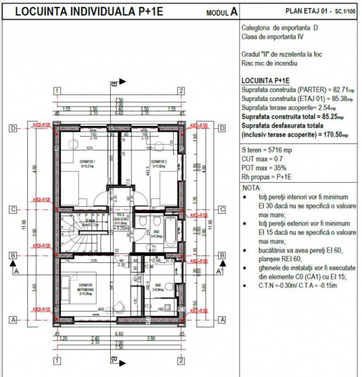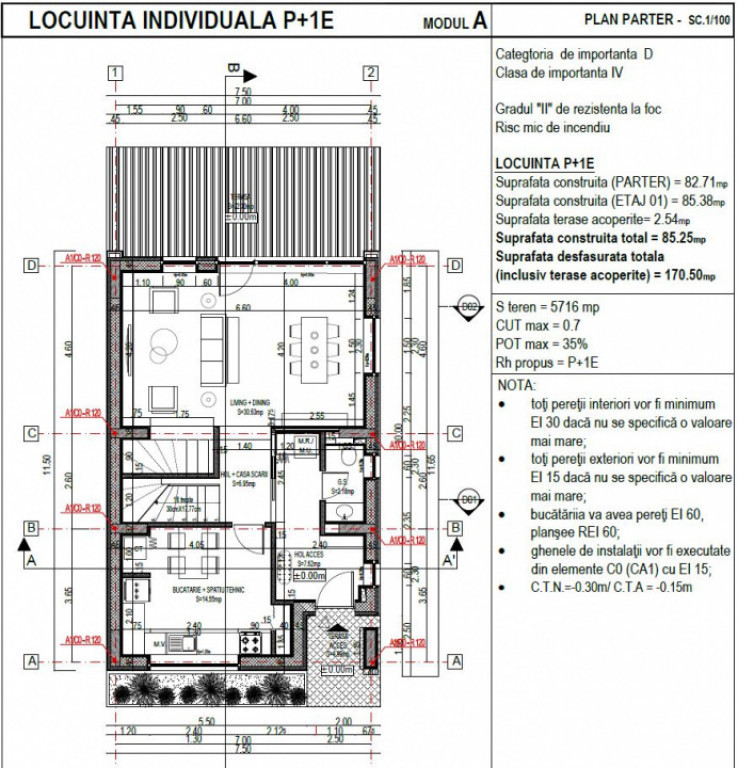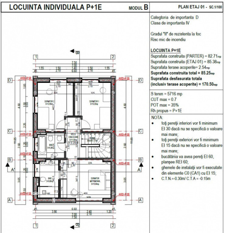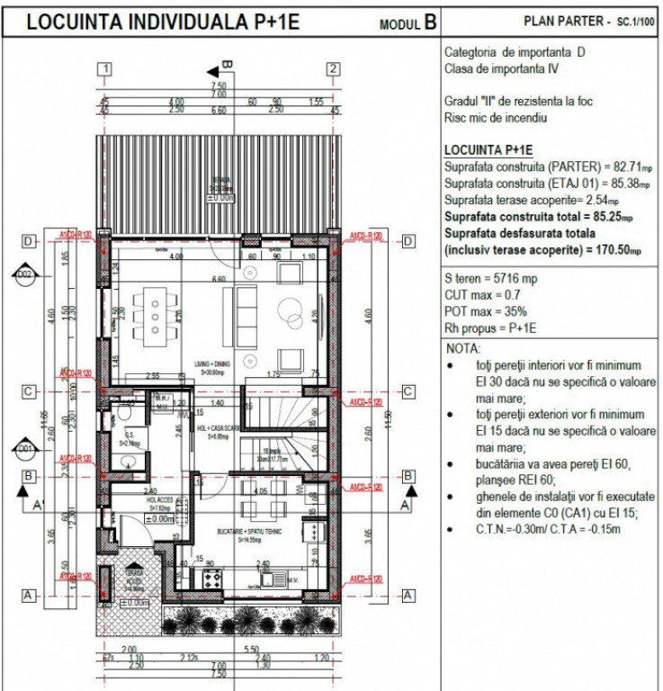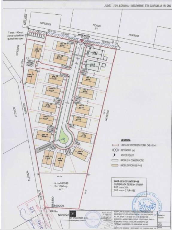 Vile moderne P+1 în ansamblu rezidențial – 1 Decembrie, Ilfov Ansamblu nou de 19 vile unifamiliale în zona Green City, 1 Decembrie (Ilfov), cu suprafață utilă de 125,7 mp și teren individual. Construcții solide din beton armat și cărămidă Porotherm, finisaje premium și design modern. Compartimentare: • Parter: living + dining, bucătărie separată, baie, spațiu tehnic, terasă acoperită • Etaj: dormitor matrimonial cu baie proprie, 2 dormitoare, baie comună, balcon Detalii tehnice: • Regim: P+1E • Suprafață desfășurată: 170,8 mp • Tâmplărie PVC tripan Schüco, izolație cu vată bazaltică 10 cm • Centrală proprie și toate utilitățile (apă, gaze, canalizare, curent trifazat) • 1 loc de parcare/locuință și spații verzi generoase Avantaje: • Complex cu acces controlat și drumuri asfaltate • Spații verzi 40% din suprafața totală • Finisaje la alegere, materiale de top • Acces rapid către București (Șos. Giurgiului) Descriere Proiect: Ansamblu Rezidențial – Locuințe Unifamiliale, 1 Decembrie, Ilfov Vă prezentăm un ansamblu modern de 19 vile unifamiliale situat într-o zonă liniștită din comuna 1 Decembrie, județul Ilfov, parte a complexului Green City. ???? Caracteristici generale: • Suprafață construită per locuință: aprox. 170,8 mp • Suprafață utilă: 125,7 mp • Suprafata teren cca: 300 mp • Amprenta casa la sol: 84.5 mp • Curte proprie, cu spațiu verde amenajat 215.5 mp • Regim de înălțime: Parter + Etaj • 1 loc de parcare pentru fiecare locuință • Suprafață teren totală: 5.716 mp, din care 40% spații verzi ________________________________________ ???? Compartimentare inteligentă: Parter (82,8 mp): • Living generos cu zonă de dining • Bucătărie separată • Grup sanitar • Hol, spațiu tehnic (centrală termică) • Terasă acoperită și terasă descoperită Etaj (85,4 mp): • Dormitor matrimonial cu baie proprie • Două dormitoare secundare • Baie comună • Hol și balcon ________________________________________ ⚙️ Detalii tehnice și finisaje: • Structură din beton armat cu închideri din cărămidă Porotherm 25 N+F • Izolație exterioară cu vata bazaltică de 10 cm Rockwool • Tâmplărie PVC Schüco Symbiotic cu geam tripan (Low-E, 44 mm) • Finisaje interioare: vopseluri lavabile, gresie porțelanată, parchet stratificat • Finisaje exterioare: piatră naturală și tencuială decorativă în nuanțe moderne • Acoperiș din tablă dublu fălțuită ________________________________________ ???? Utilități și dotări: • Racord la energie electrică trifazată, apă, canalizare și gaze • Sistem de încălzire individuală cu centrală termică proprie • Rețea completă de iluminat stradal, trotuare și drumuri asfaltate (4 m lățime) • Platformă betonată pentru colectarea selectivă a deșeurilor ________________________________________ ???? Mediu și siguranță: • Respectă toate normele de siguranță la incendiu și igienă sanitară (conform Ordin M.T.C.T. și M.A.I.) • Materiale neinflamabile, clasă de reacție la foc A1 • Nivel de zgomot redus și izolare fonică între camere • Fără surse de poluare – construcții prietenoase cu mediul ________________________________________ ???? Acces și împrejmuire: • Drumuri interioare asfaltate și iluminate • Acces controlat prin barieră automată • Gard perimetral semitransparent (înălțime 2 m), completat cu gard viu între locuin Id intern: P221513