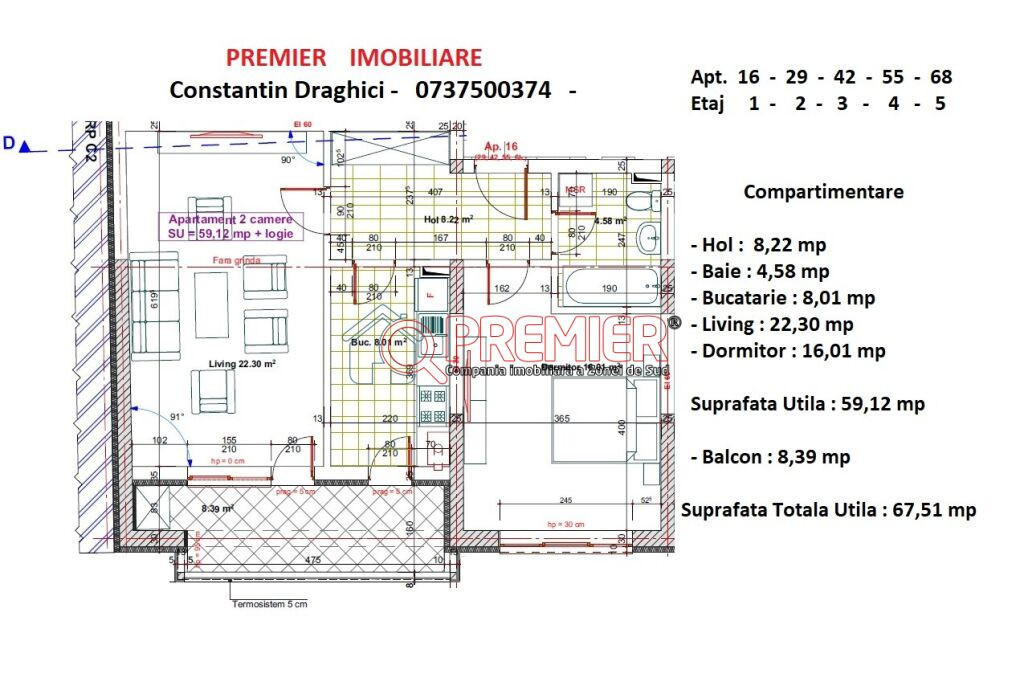 Premier Imobiliare va ofera spre vanzare un apartament de 2 camere decomandat de 67,51 mp la pretul promotional de: