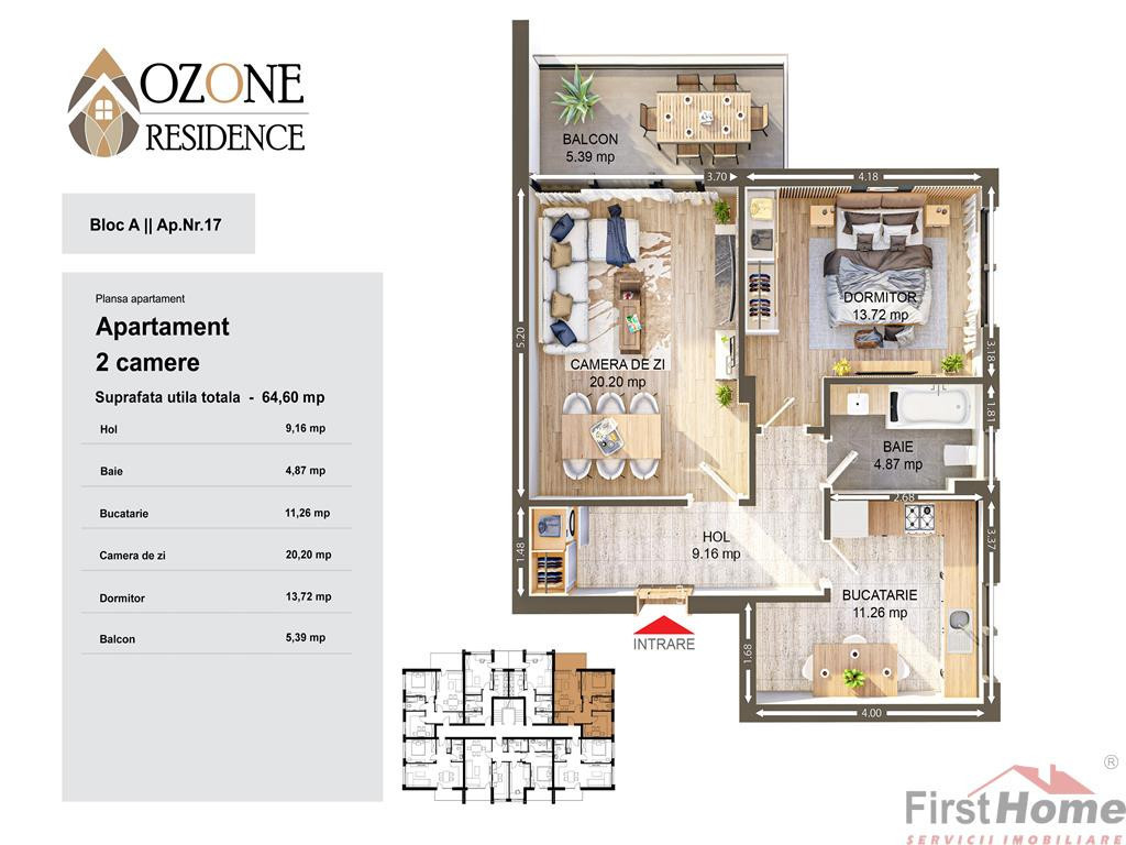 COMISION 0 %- REPREZENTARE EXCLUSIVA! Avem placerea sa va prezentam cel mai exclusivist proiect din zona de Nord a orasului, complex Ozone City pune bazele celui mai nou si modern ansamblu rezidential din Focsani. Dezvoltatorul vine cu o vasta experienta de pe piata din Brasov si Focsani unde a costruit / vandut cateva sute de apartamente . Complexul dispune de 7 blocuri P 4. Apartament 2 camere Suprafata utila - 65 mp Incalzire in pardoseala, centrala termica prin condensare. Apartamentele vin cu Aer conditionat montat, INCLUS IN PRET! Obiecte sanitare in baie incluse in pret precum : oglinda, chiuveta baterie si dulapior, vas toaleta, calorifer portprosop. GEAM LA BAIE! Pentru detalii si vizionari va asteptam la sediul Agentiei Imobiliare First Home pe strada Stefan cel Mare numarul 13 sau la telefon 0725 919 334. ID:3050
