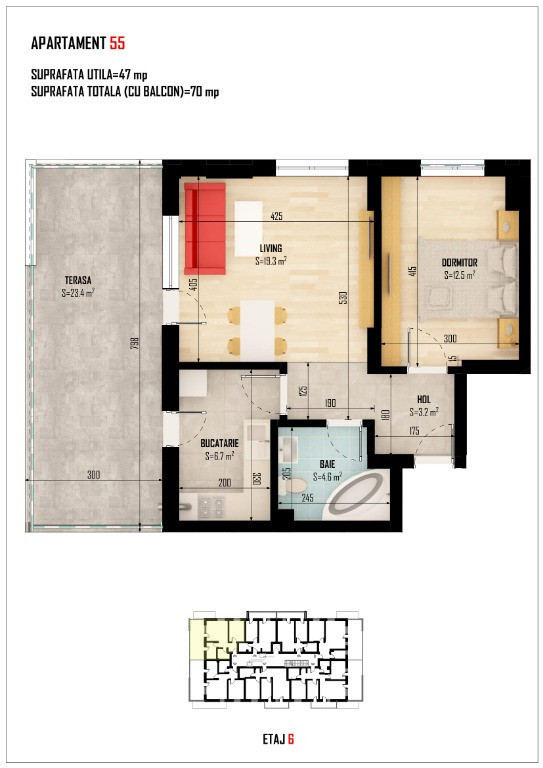 Apartament cu 2 camere, complet decomandat ce vine in completare cu o terasa superba de 23 mp. Caracteristici cheie: • Suprafață generoasă de 70mp, oferind spațiu pentru confort și relaxare. • Dormitor primitor, ideal pentru nopți liniștite de odihnă. • Living luminos, perfect pentru momente de relaxare sau petreceri cu prietenii și familia. • Bucătărie modernă. • Baie elegantă și funcțională, pentru răsfăț și îngrijire personală. • Hol de acces spațios, care facilitează circulația și organizarea în apartament. • Terasa privata, ideala pentru a savura o cafea dimineața sau pentru a admira apusurile spectaculoase. • Situat la etajul 6 al unei clădiri rezidențiale de tip P+6E. • Zonă liniștită,oferind un mediu perfect pentru relaxare și refacere. Detalii suplimentare: • Acces facil către mijloacele de transport în comun, magazine, școli și alte facilități. • Oportunitate perfectă pentru cei în căutarea unei locuințe confortabile sau a unei investiții sigure în imobiliare. Pret promotional=valabil in Faza 1: 69.000 Euro tva inclus. Nu ratați această ocazie unică! Contactați-ne astăzi pentru a programa o vizionare sau pentru mai multe informații!
