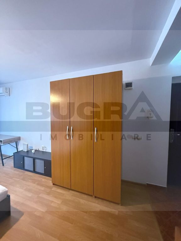 Bugra Imobiliare ofera spre inchiriere un apartament cu 1 camera, decomandat, situat intr-un imobil nou, din cartierul Gheorgheni, zona Interservisan. Situat la etajul 3, intr-un imobil nou cu 3 etaje, acest apartament dispune de o suprafata utila de 35 mp, compartimentati astfel: Dormitor Bucatarie Hol Baie Balcon de 7 mp Apartamentul se inchiriaza complet mobilat si utilat exact ca in poze si dispune de centrala termica si aer conditionat. Inclus in pretul de inchiriere, este si un loc de parcare privat, in curtea imobilului. Va asteptam cu drag la vizionari!