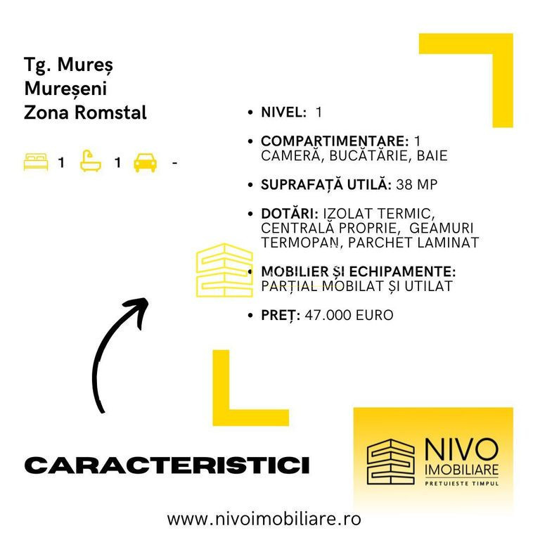 BV/313 Nivo Imobiliare vă propune spre vânzare acest apartament situat în Tg. Mureș, cartierul Mureșeni, Zona Romstal. Apartamentul se află la etajul 1 și este compus din 1 cameră, bucătărie și baie având suprafața totală 38 de mp. Este izolat termic, dotat cu centrală proprie, geamuri termopan și parchet laminat. Se vinde parțial mobilat și utilat la prețul de 47.000 Euro 0% comision pentru orice imobil cumpărat.